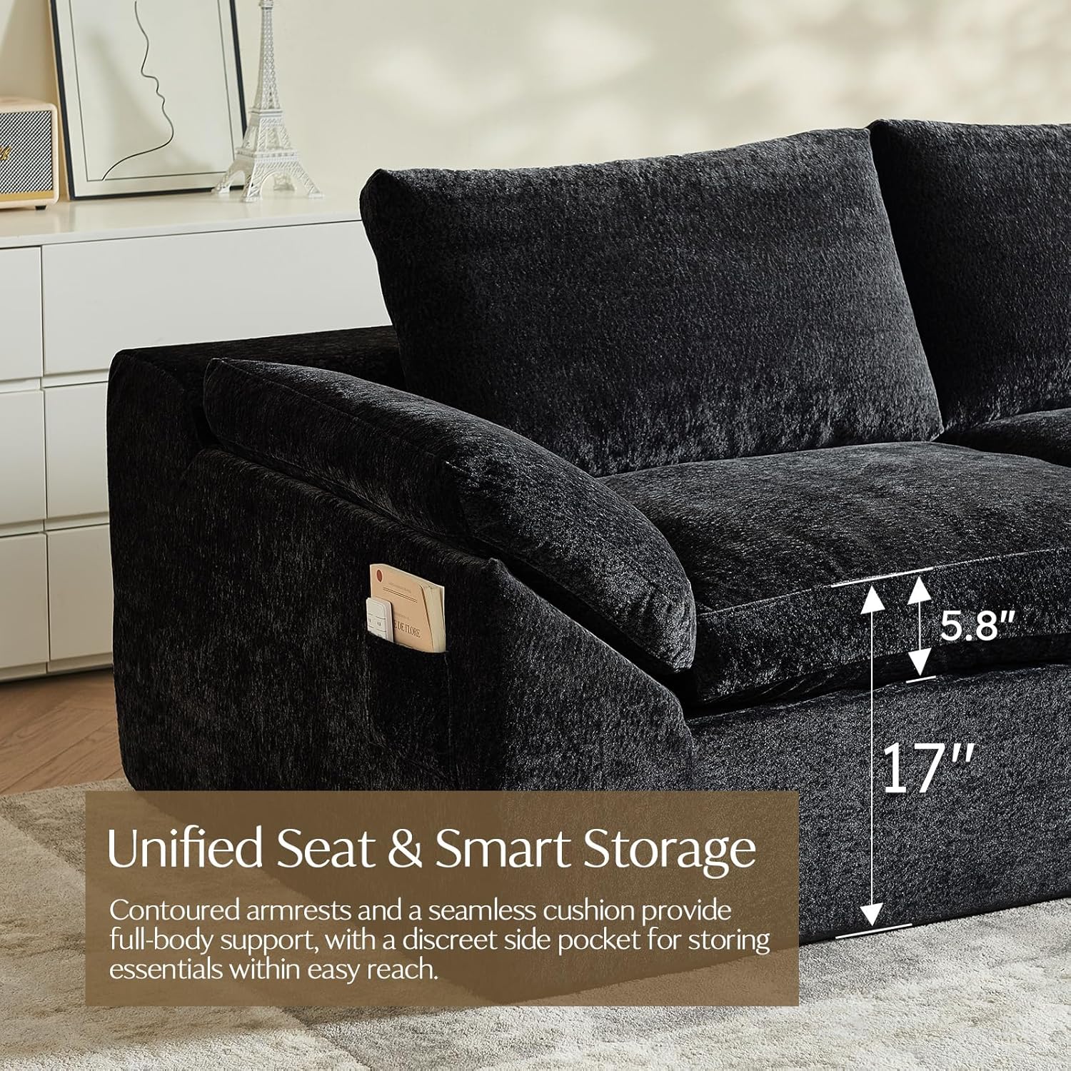 Premium Material: Live comfortably without worrying about spills or pet damage. Our luxuriously soft velvet upholstery features a tight weave that resists scratches, stains, and everyday wear. The sectional couches for living room stays beautiful through everyday life, ideal for busy households that value both design and practicality