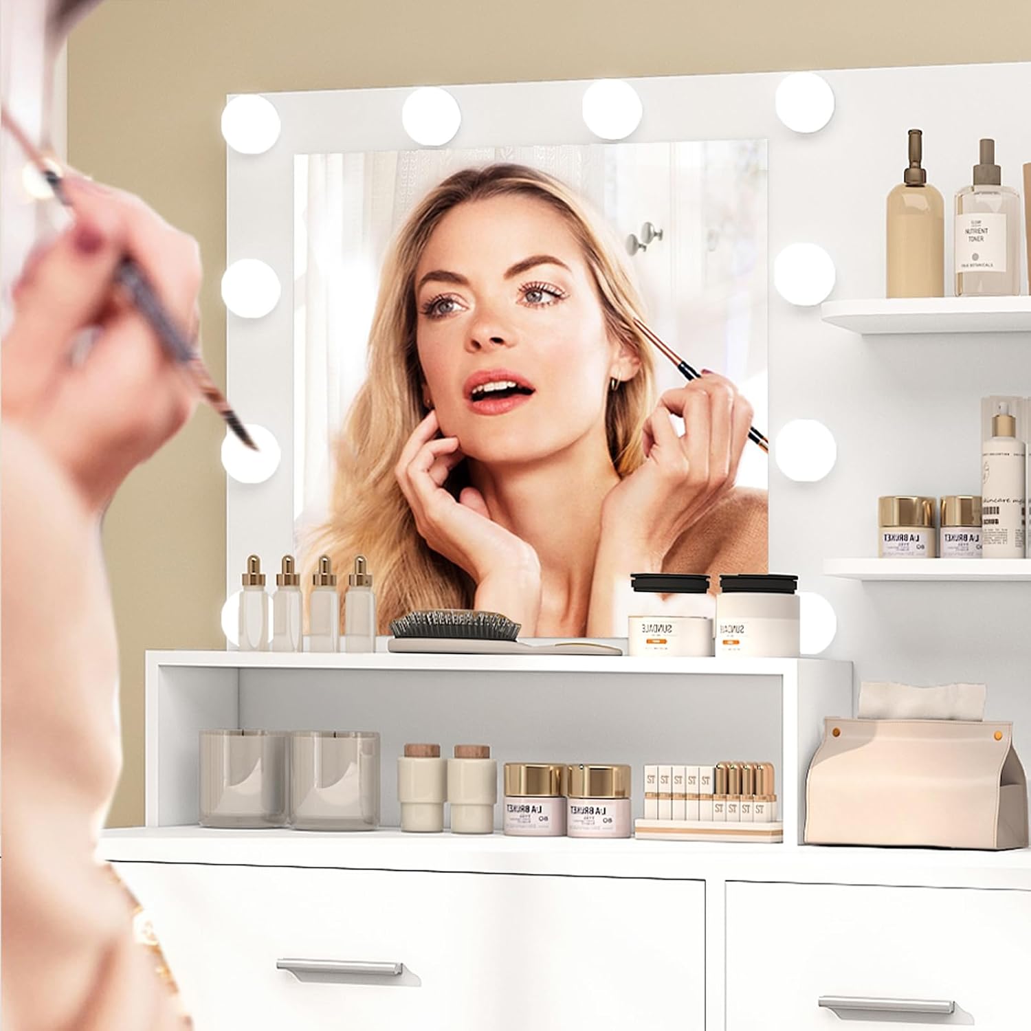 【Your Perfect Lighting】Get camera-ready lighting anytime! Our vanity features 10 Hollywood-style bulbs with 3 color modes (Warm, Natural, Cool). Simply tap the touch switch to change the light color, or hold it down to adjust the brightness like a dimmer. Perfect your makeup, skincare routine, or just set the mood, create the ideal ambiance for any moment