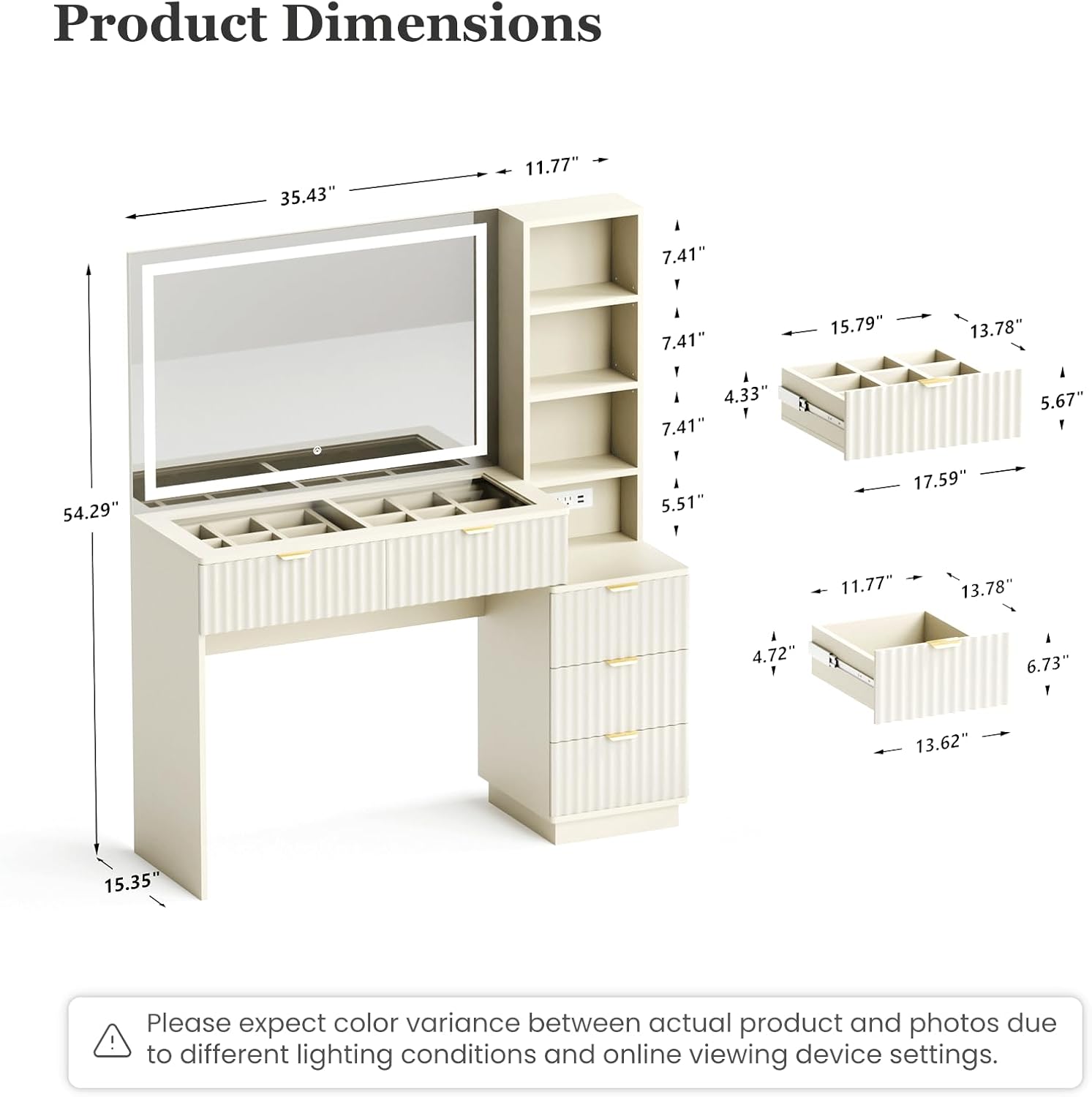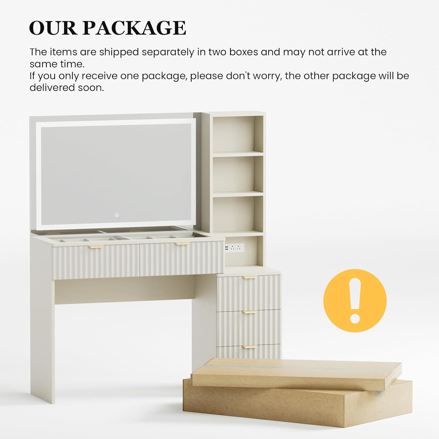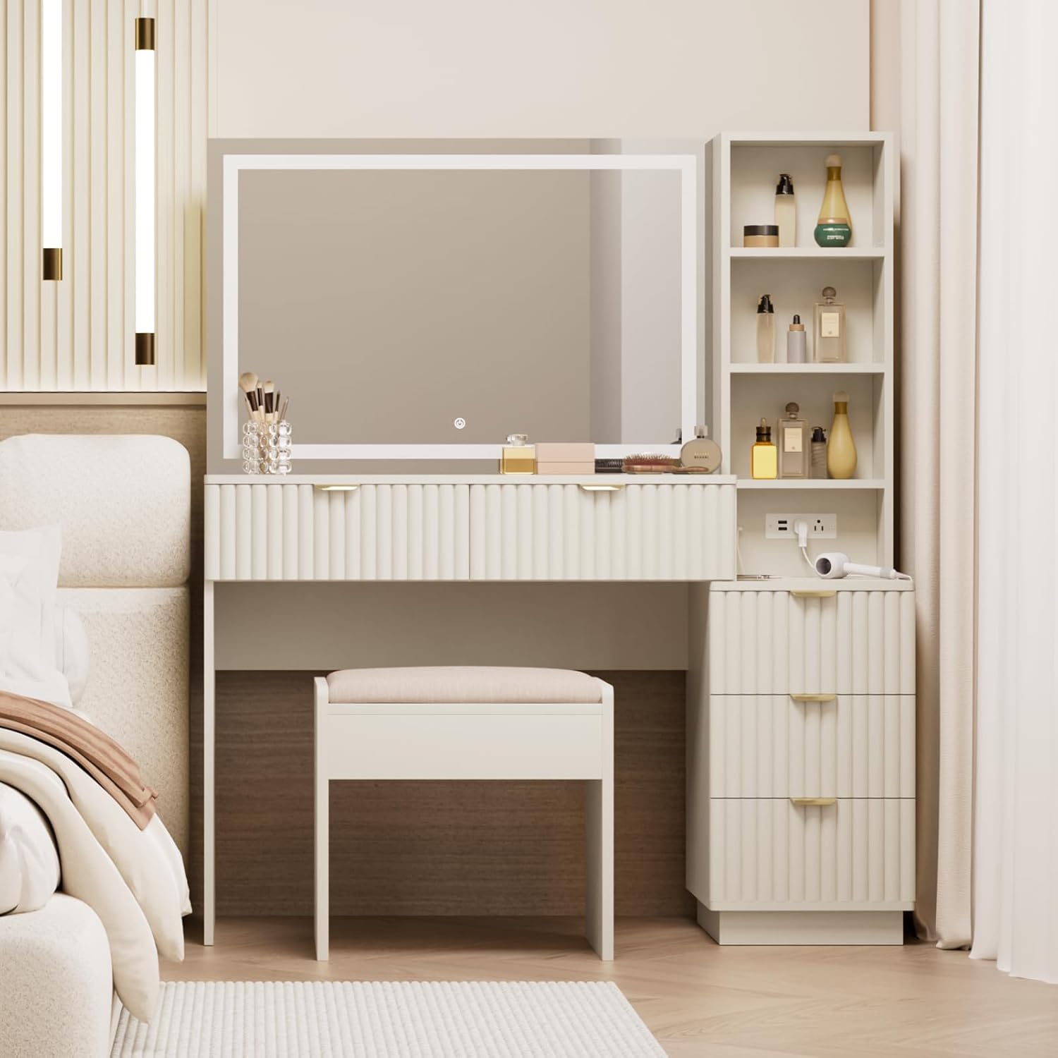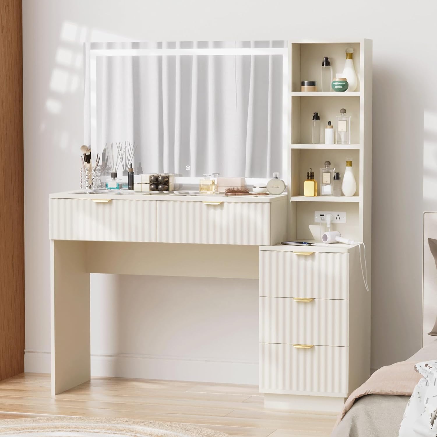 【Powerful Storage Capacity】This vanity table features 5 drawers and 3 open shelves, offering ample space to organize your makeup, hair tools, and skincare products. Say goodbye to clutter and enjoy a neat, functional beauty station