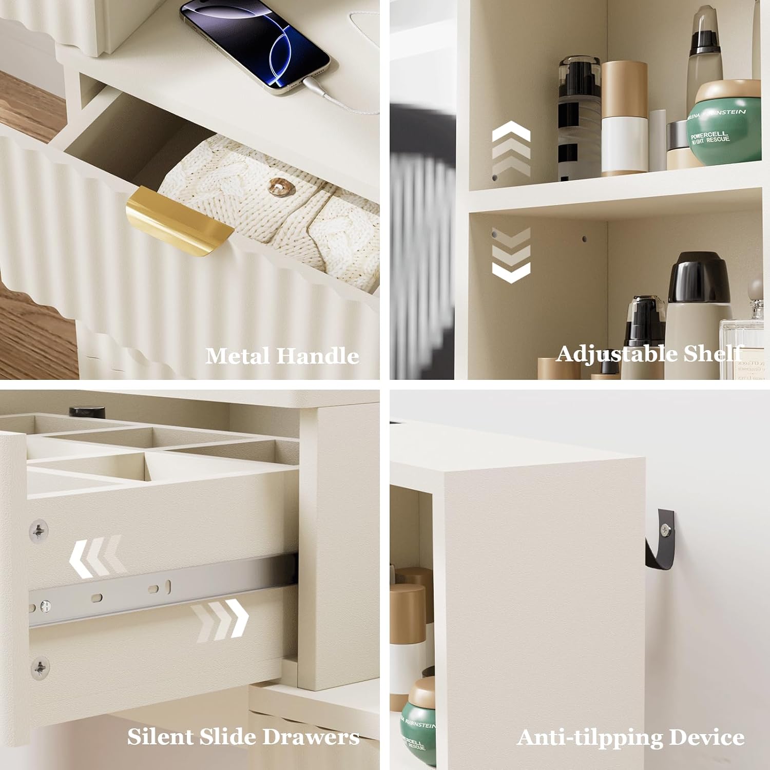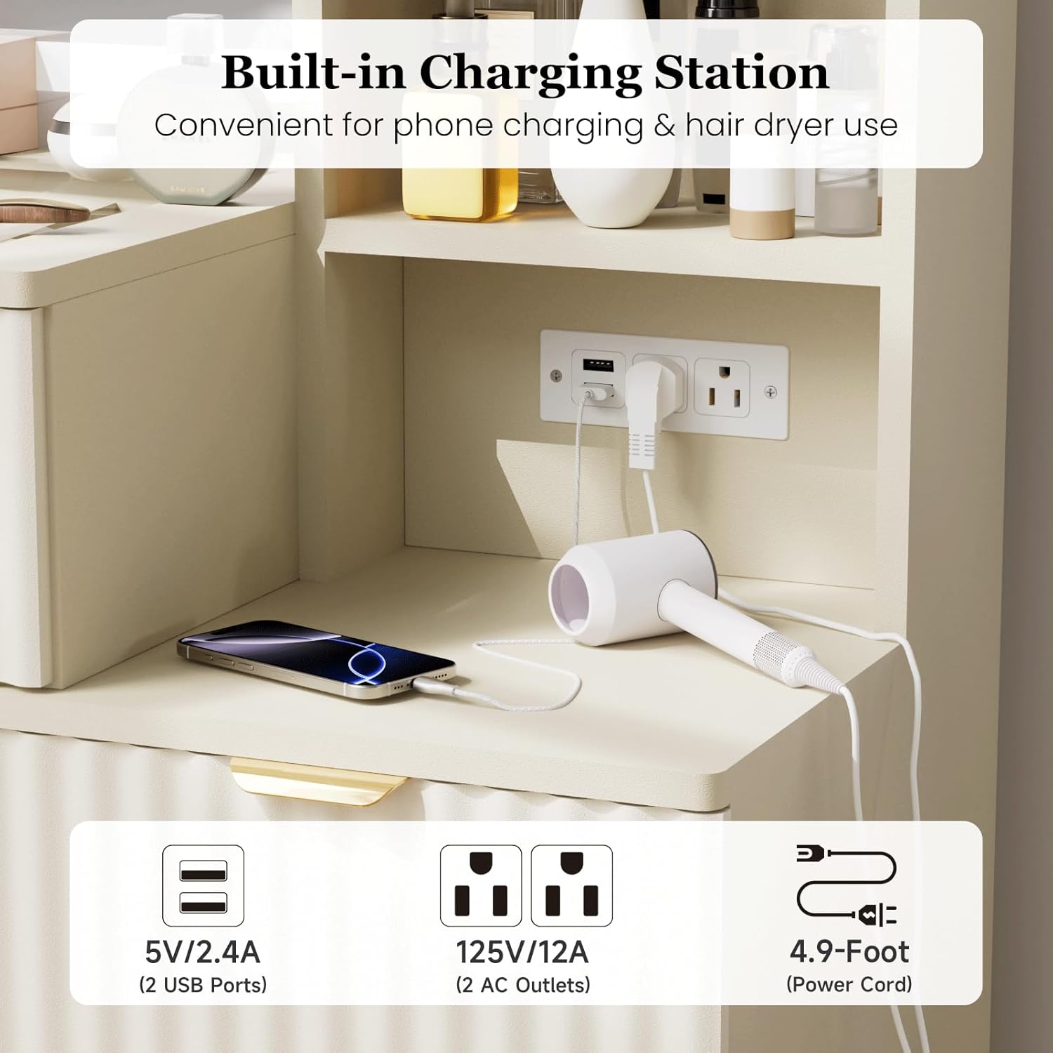 【Vanity Desk with Charging Station】This vanity comes equipped with a built-in power outlet featuring 2 standard sockets and 2 USB ports—perfect for charging your phone or powering beauty tools like hair dryers and curling irons. Keep everything organized and within reach to streamline your daily routine