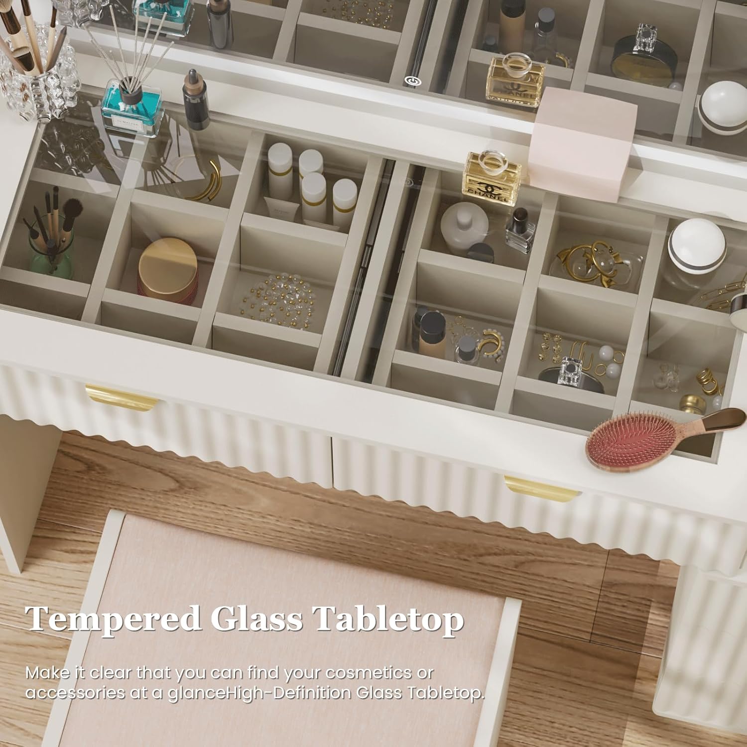 【Upgraded Durable Materials】Crafted from high-quality wood, this vanity desk features sturdy legs and smooth, silent drawer slides for a solid and durable structure. The scratch-resistant surface is sleek and easy to clean, making everyday use worry-free