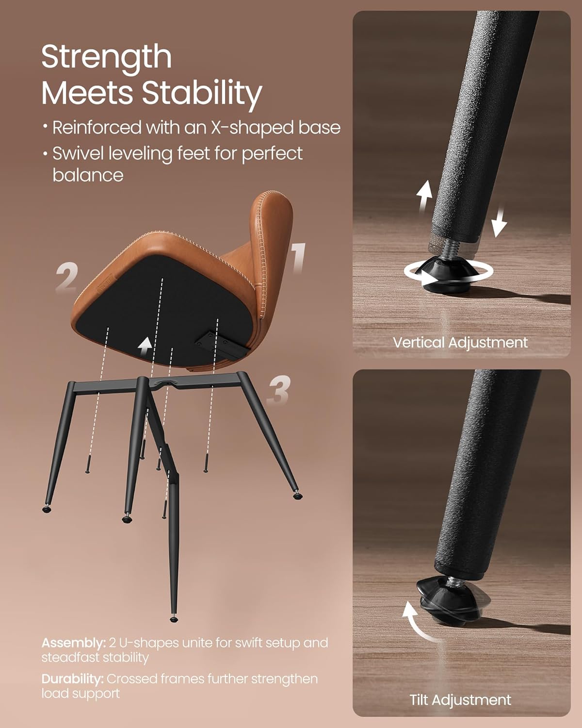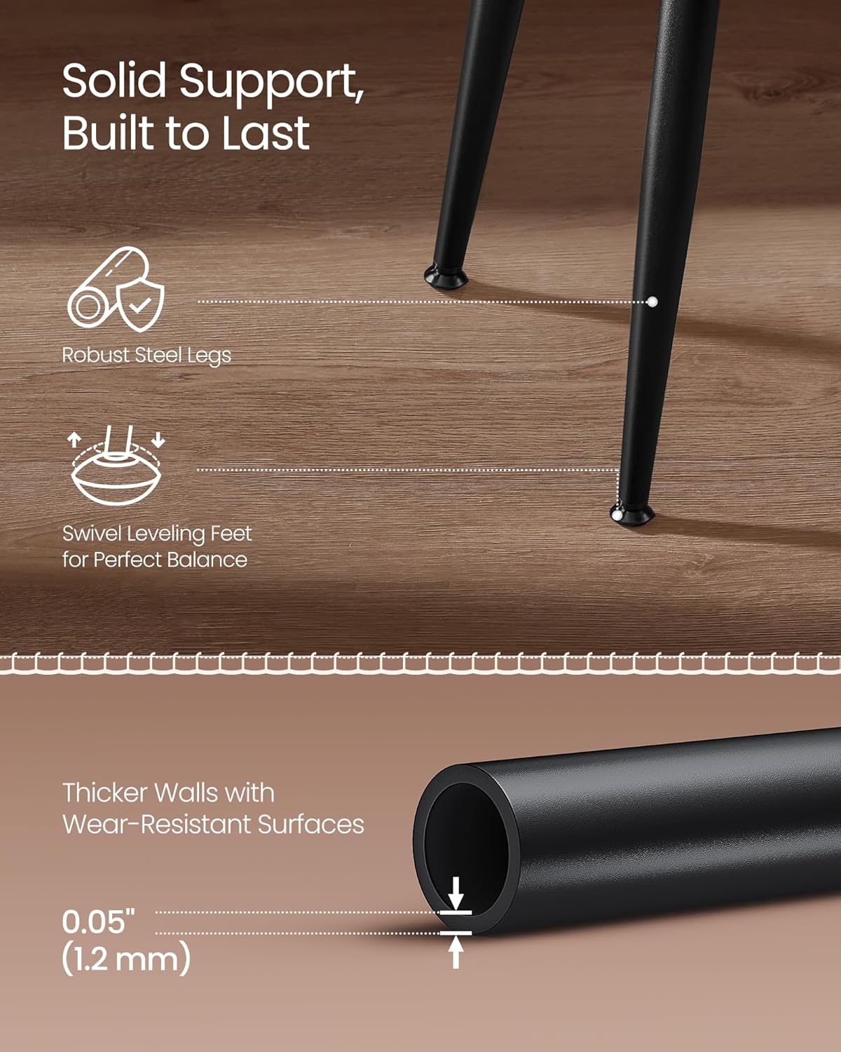 [Strength Meets Stability] The robust steel legs of these kitchen chairs form a firm foundation, effortlessly supporting up to 265 lb. The swivel leveling feet ensure stability, even on slightly uneven surfaces, and prevent floor scratches