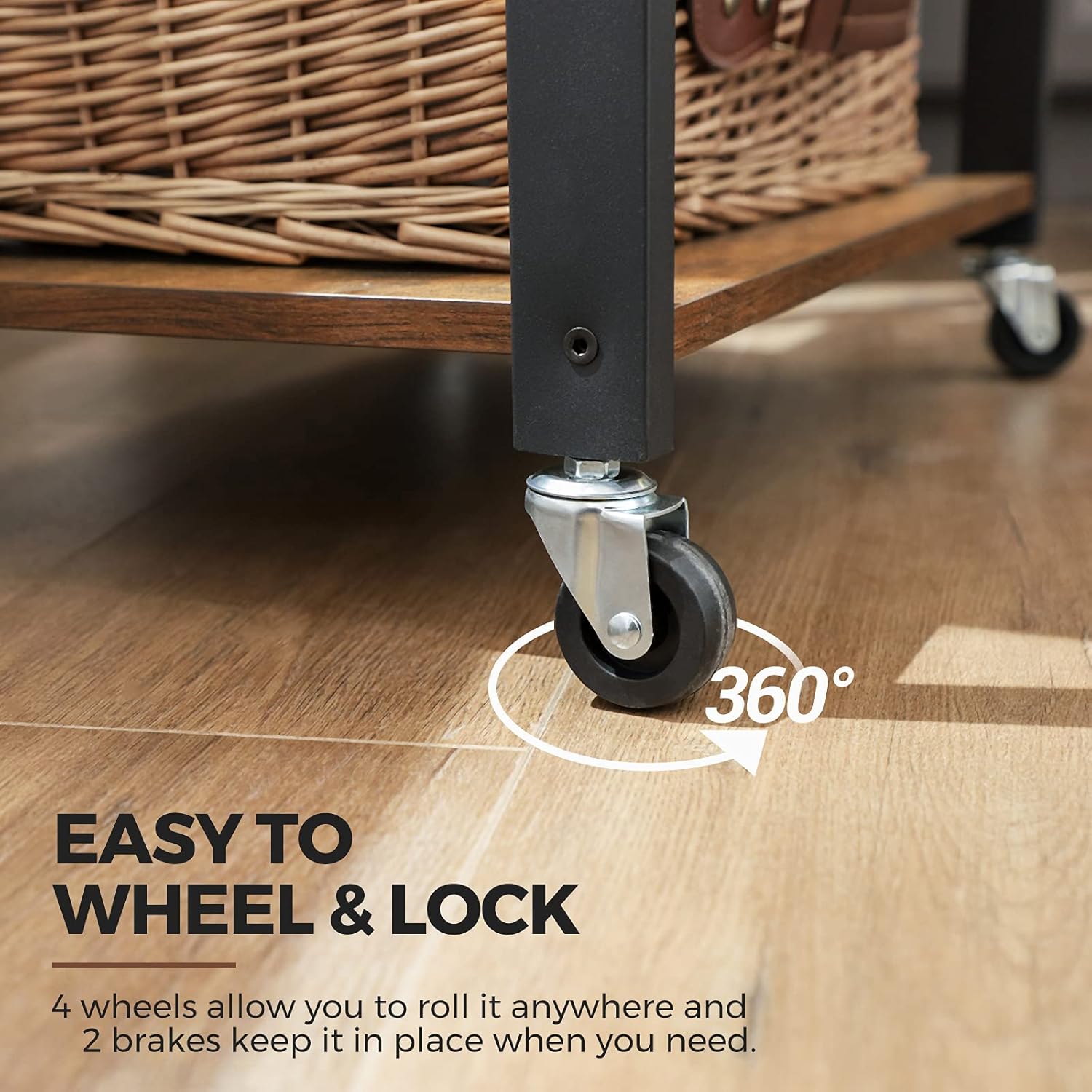 VASAGLE Kitchen Shelf on Wheels, 23.6 Inches Serving Cart with 3 Shelves, Kitchen Cart, Microwave Shelf, for Mini Oven, Toaster, with 6 Hooks, Industrial Style, Rustic Brown and Ink Black UKKS60XV1