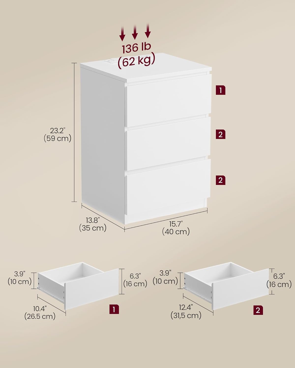 VASAGLE Nightstand with Charging Station, 2 AC Outlets and 2 USB Ports, Bedside Table, Side Table with 3 Drawers, Modern Style, 13.8 x 15.7 x 23.2 Inches, Cloud White ULET631W16