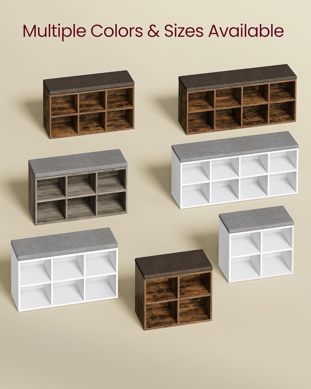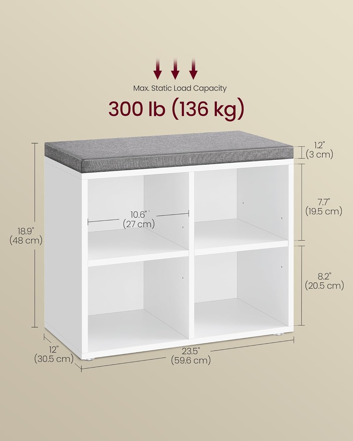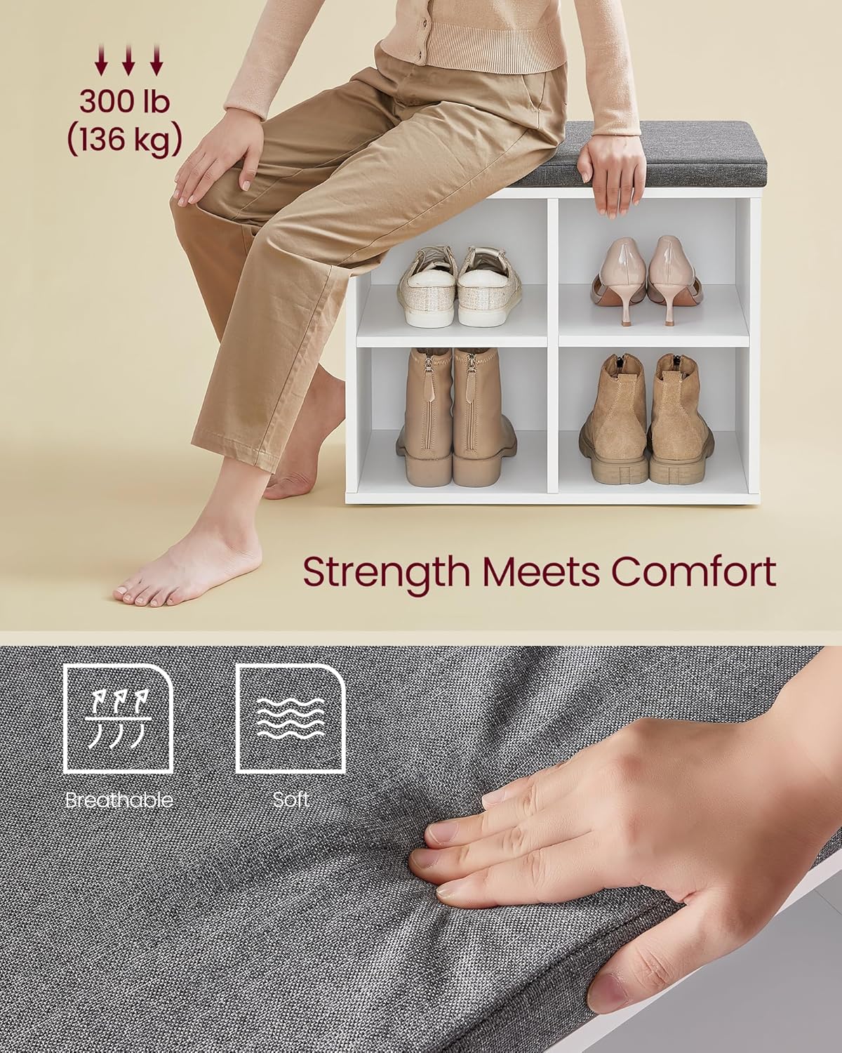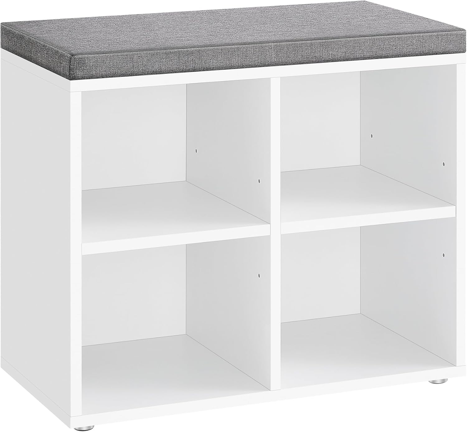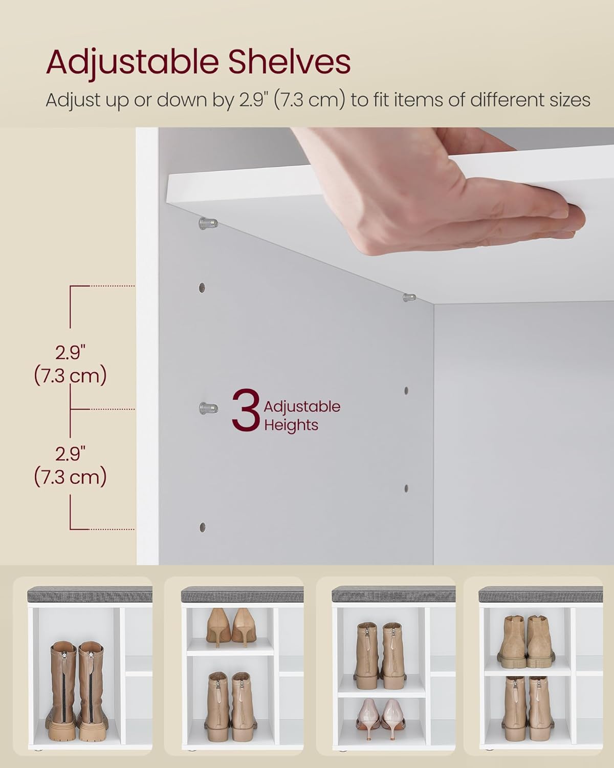 VASAGLE Shoe Bench with Cushion, Shoe Storage Bench with 4 Compartments and 2 Adjustable Shelves, Entryway Bench with Padded Seat, for Bedroom, Closet, Living Room, Cloud White ULHS234W01