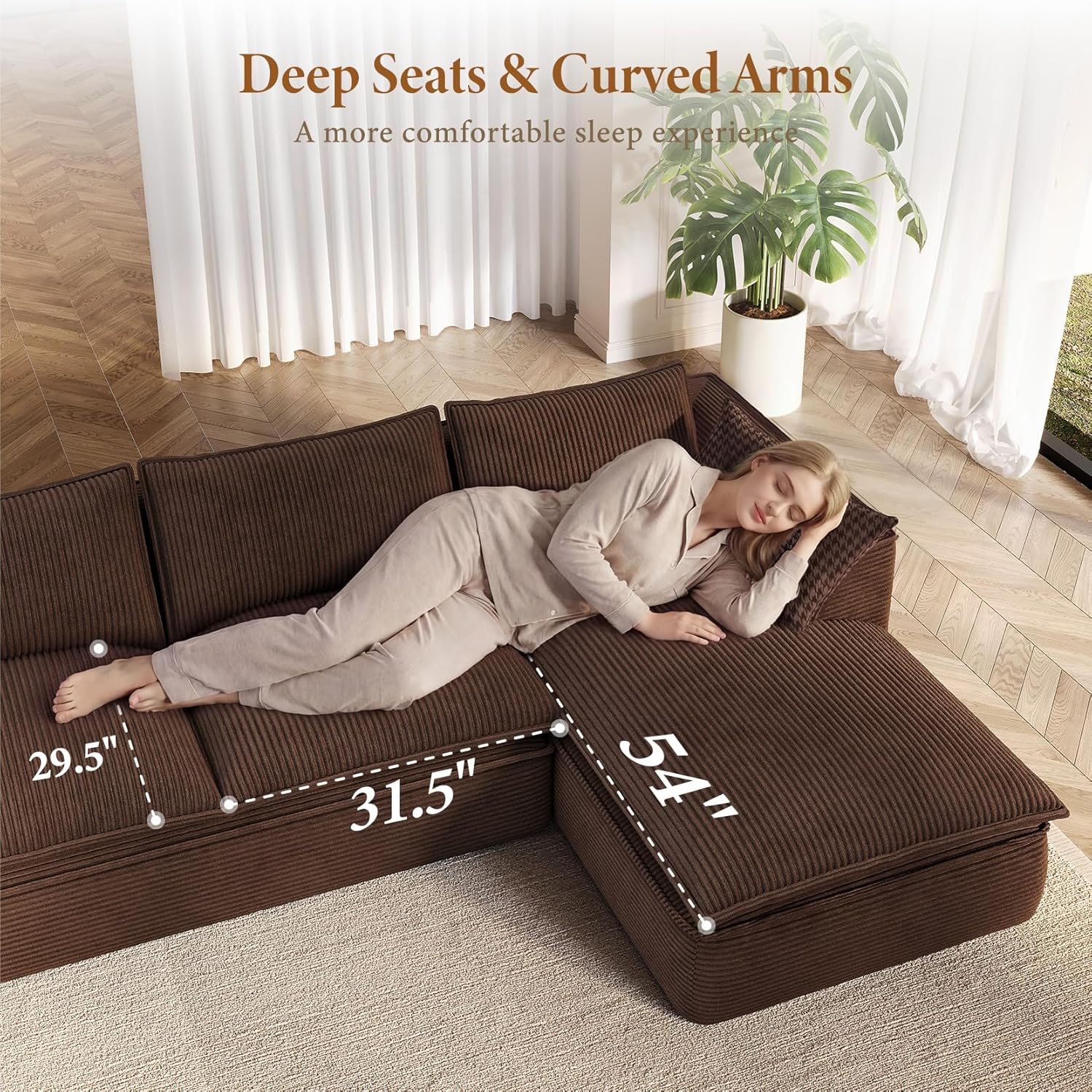 Ultra-Soft Corduroy Touch: Crafted from high-quality corduroy fabric, this modular sectional offers a perfect blend of softness and durability for everyday comfort. The textured material is gentle on the skin, resistant to pilling, and easy to care—ideal for homes with children and pets. Its simple solid-color design adds warm refinement to your space, and multiple color is for options to match various decor styles. (Note: Actual color may vary due to lighting or monitor settings.)