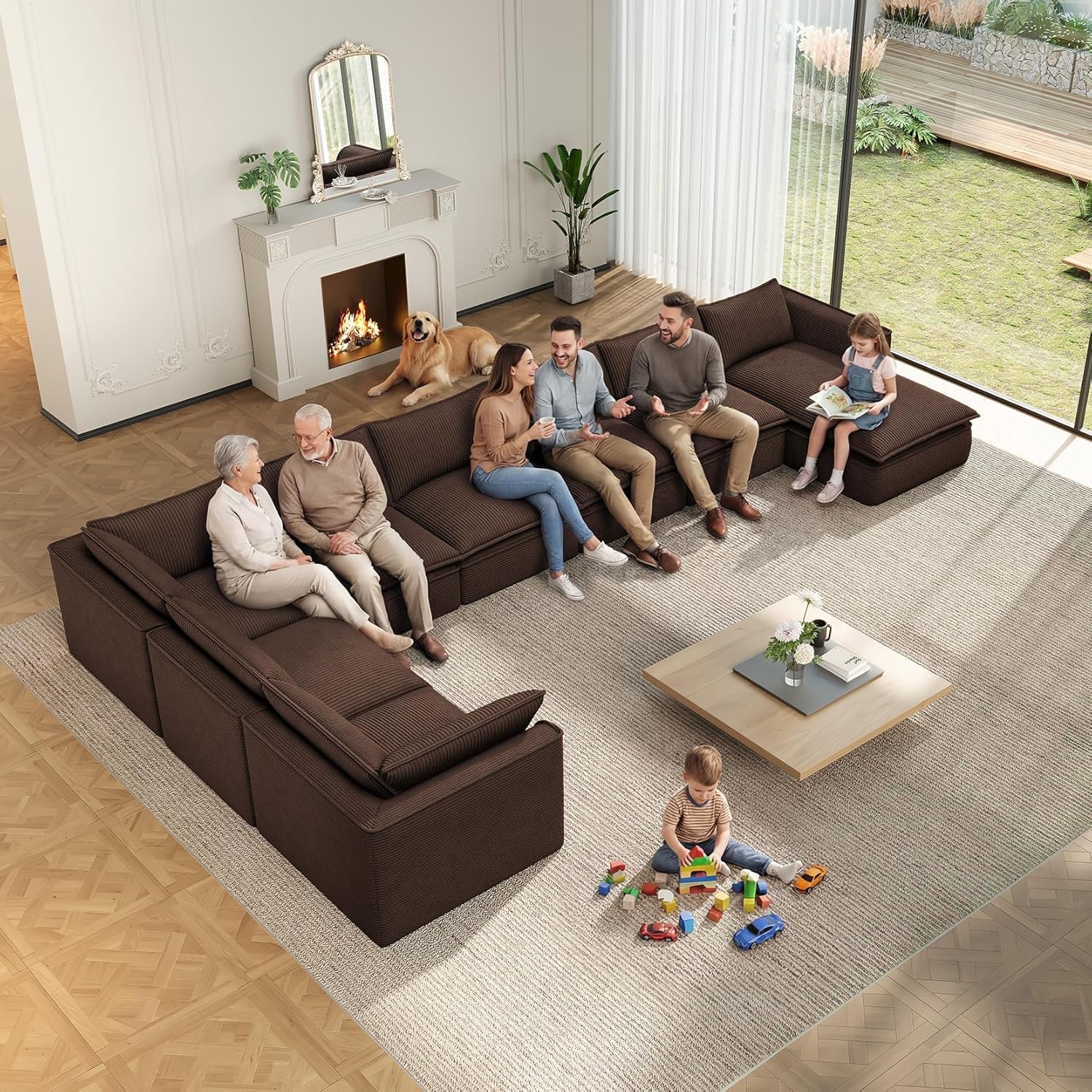 Vesgantti 141.7″ Oversized Boneless Sectional Couch, Modern 7 Seater Modular Sofa with Chaise & Ottoman, Deep Seat Corduroy Cloud Couches for Living Room, No Assembly Required, Dark Brown