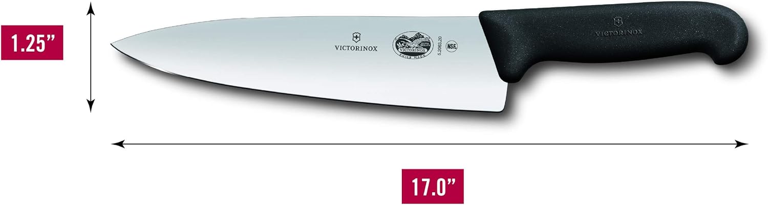 A trusted favorite preferred by both home chefs and culinary professionals, the 8″ Fibrox Pro chef’s knife can handle nearly every kitchen task imaginable. Crafted with a comfortable handle, superior weight and balance, and a razor sharp edge that rarely requires re-sharpening, this knife is an essential tool for every kitchen. key features high-quality, lightweight European steel. handle design reduces hand and wrist fatigue. fit for dicing, mincing, chopping, slicing, and shredding. long, sloping curved blade that “Rocks” for effortless mincing and chopping. flat spine for extra power to slice through hard-skinned items. non-slip patented Fibrox Pro handle for a secure and comfortable grip No matter the hand size. National sanitary foundation (NSF) approved and dishwasher safe. be good to your knives and they’re be good to you. Following these simple guidelines will ensure that you get the longest life out of your knife! Victorinox Swiss Army recommends washing all knives by hand. For best results, hand wash your knives with a soapy cloth and dry immediately. while Fibrox Pro knives are dishwasher safe, We recommend hand washing as dishwashers are designed to spray water at a relatively high pressure, which can jostle the silverware and cause the knives to collide, dulling the edge. sharpening for optimum performance, knives should be honed after every couple of uses. Proper and frequent use of a honing steel will keep your knives sharper and performing at their best. formerly Forschner in 1937 Victorinox began selling cutlery in America through a Connecticut distributor called R. H. Forschner & Co. A well-known manufacturer of butcher scales, Forschner soon became the exclusive U. S. Distributor for Victorinox knives, and was the name by which Victorinox knives were known.