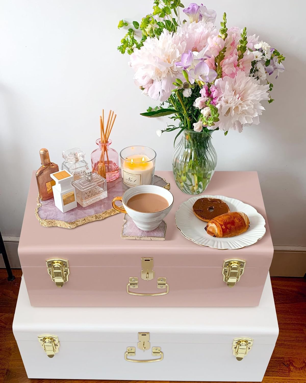 Vixdonos Metal Trunk Decorative Storage Box Set of 2 College Dorm Chest with Handle (Pink and White)