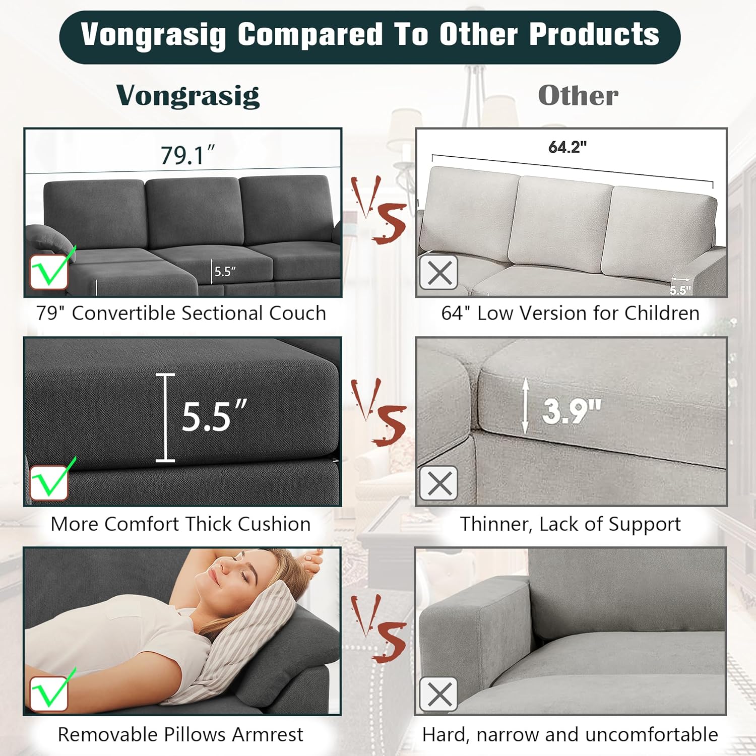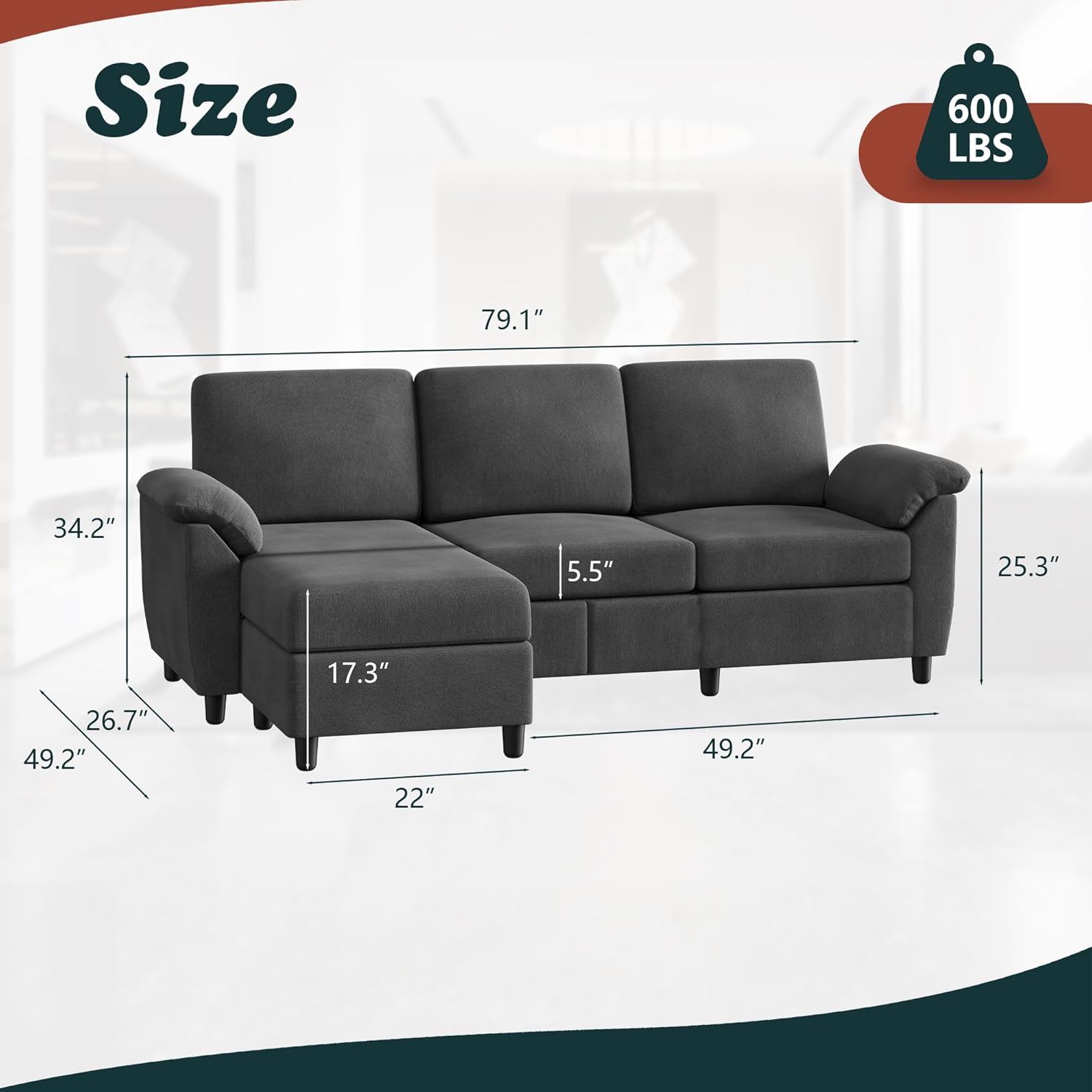 Vongrasig 79″ Convertible Sectional Sofa Couch, 3 Seat L Shaped Sofa with Removable Pillows Linen Fabric Small Couches Mid Century for Living Room, Apartment and Office (Black)