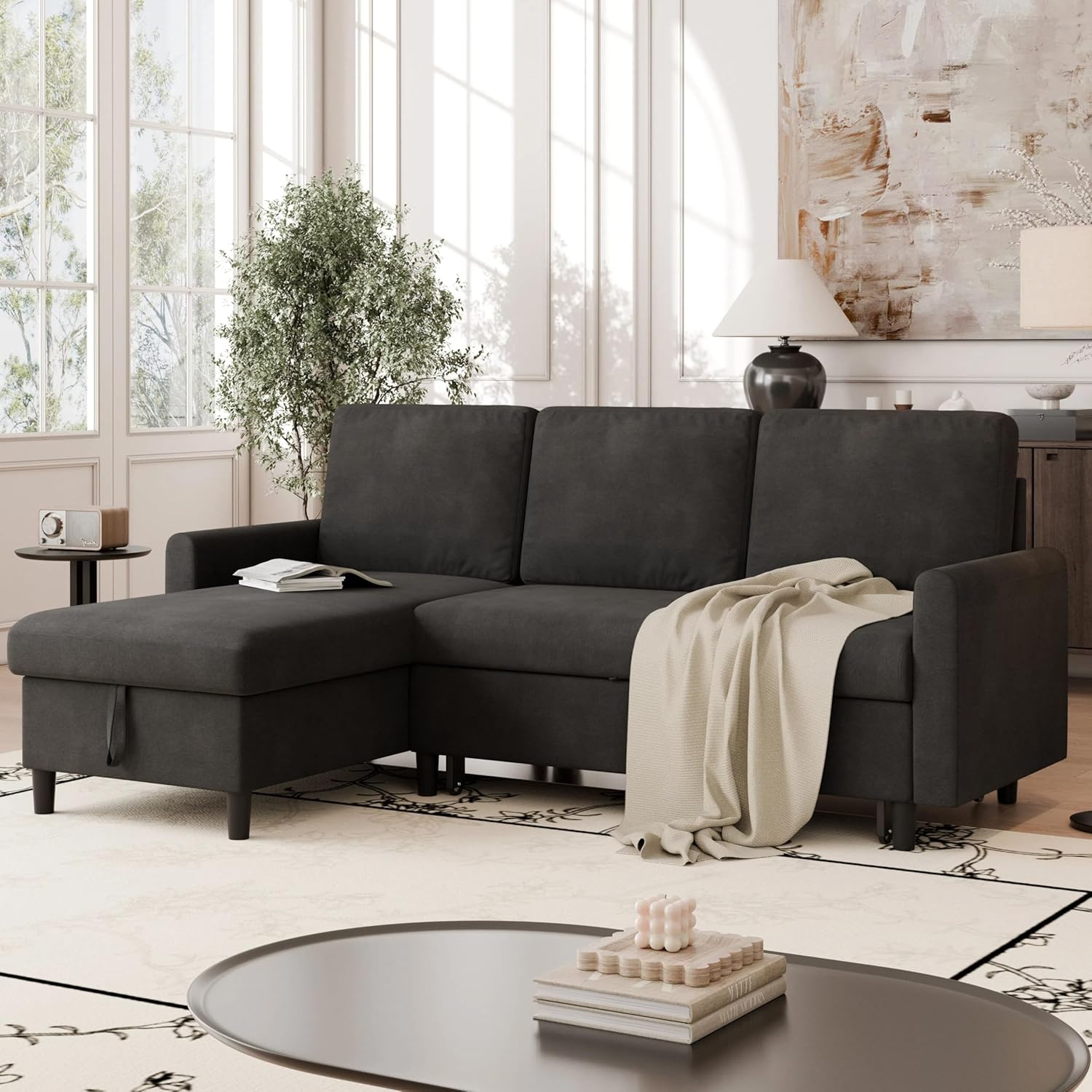 Vongrasig Convertible Sleeper Sofa Bed, Pull Out Couch with Storage, 77″ L-Shaped Sofa Bed with Storage Chaise Linen Fabric for Living Room, Apartment, Small Space, Black