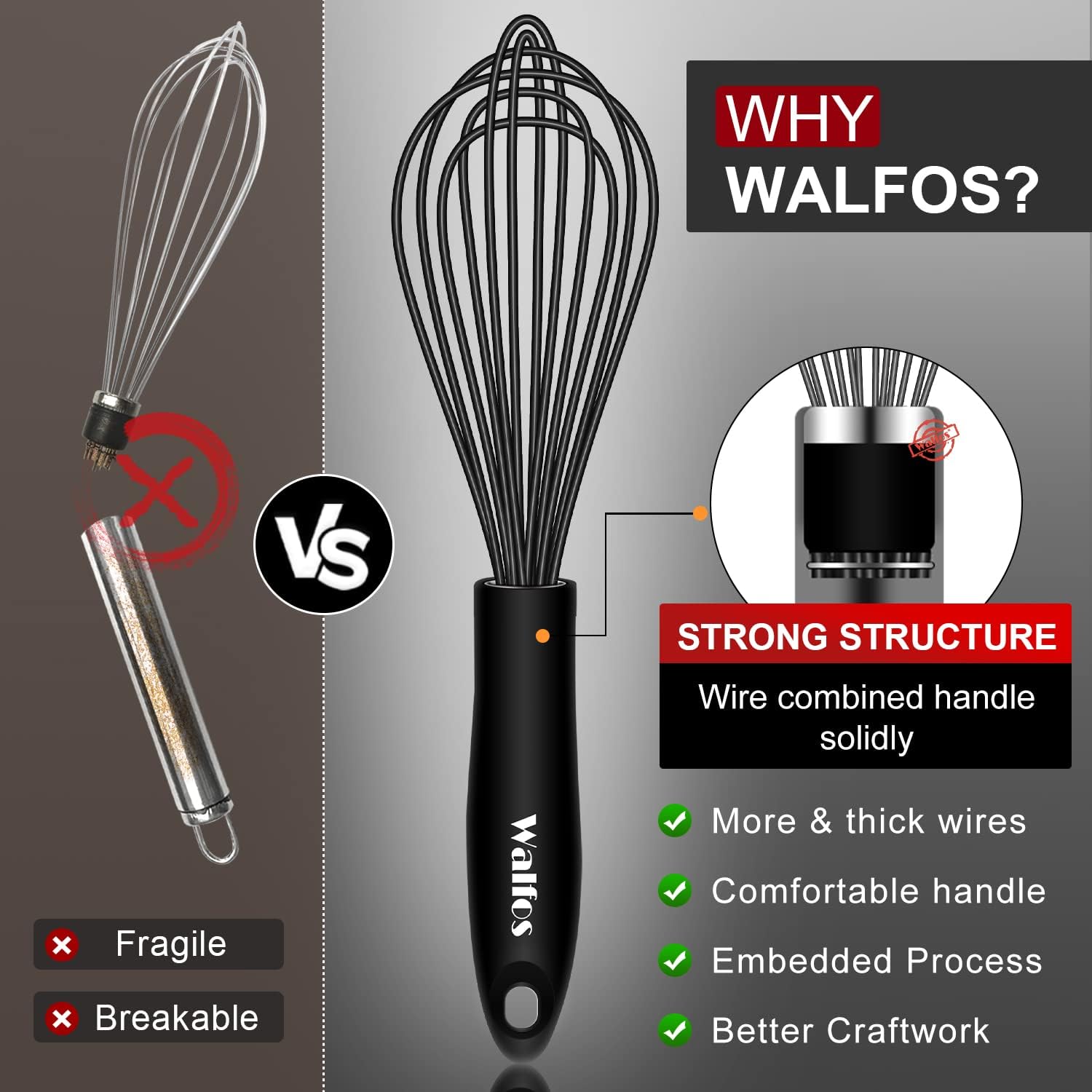 Dishwasher Safe : Walfos wisk is Zero Residue Design, hand-washable making your life in the kitchen easier every day. The end of the handle designed with a hook allow for easy hanging and drying, less mess