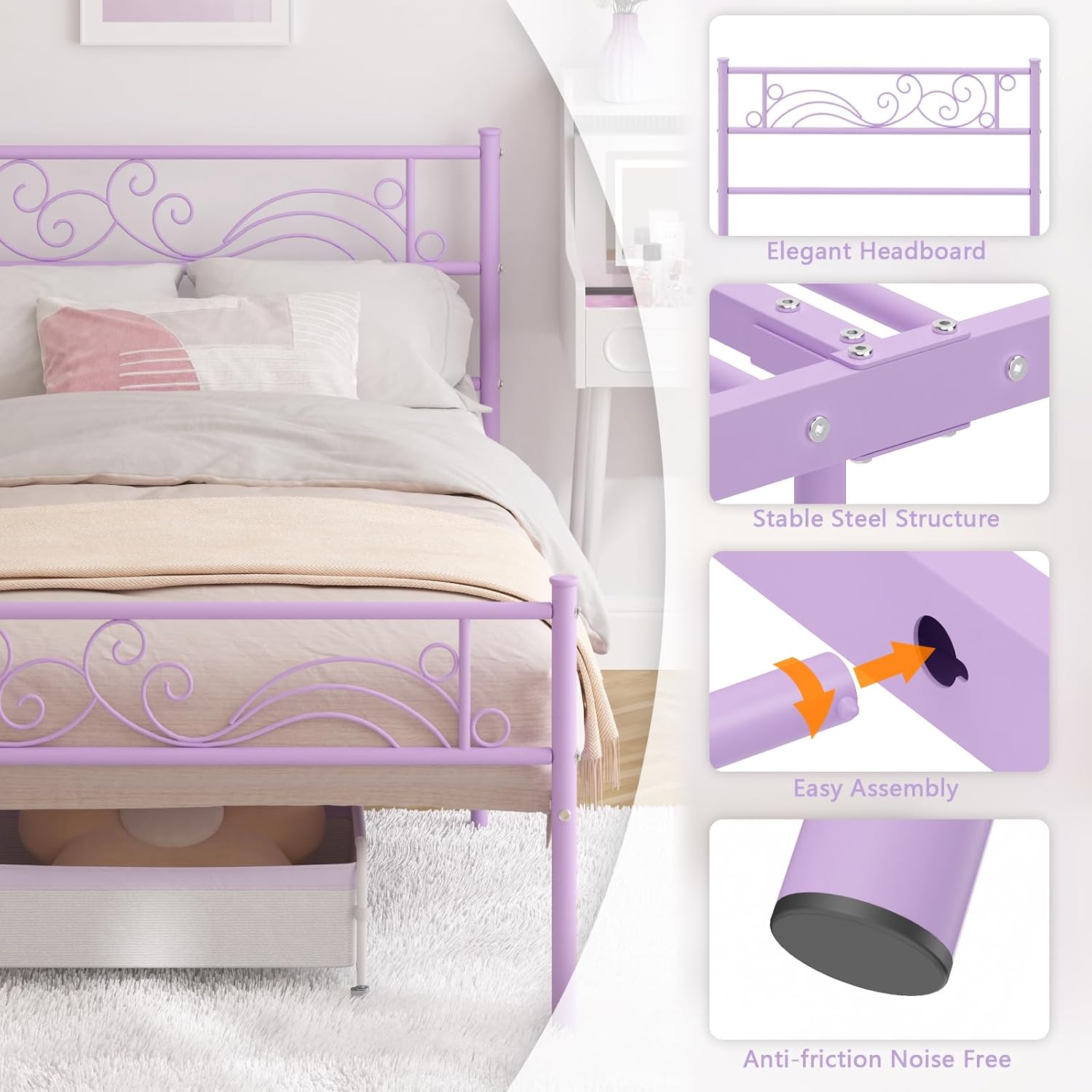 Color Purple Material Metal Product Size 77.5″x 39.2″ x34.8″(L*W*H) Weight Capacity 450lbs Under-bed Storage Height 11.2 inches Box Spring Needed No Assembly Required Yes