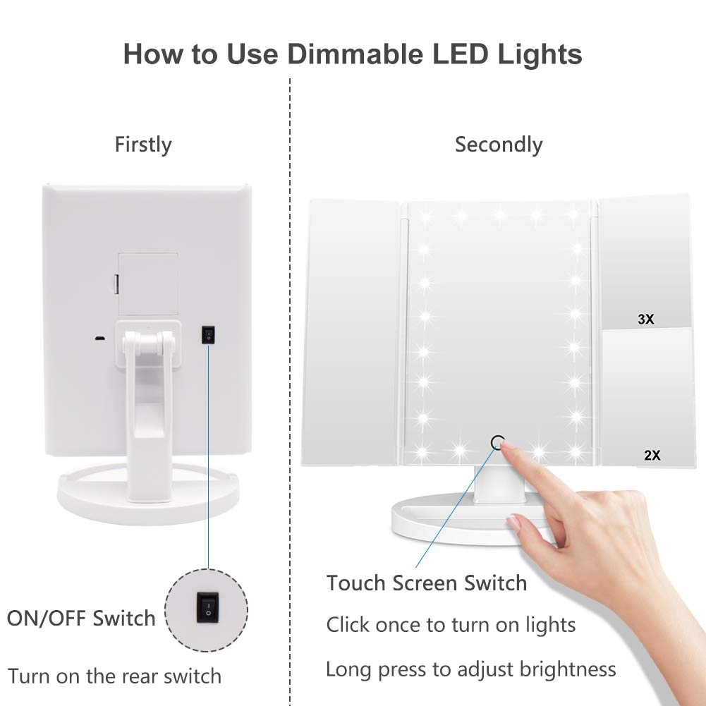 180 degree rotation & Tri-fold: The light-emitting makeup mirror on the worktable can be easily adjusted, and the viewing angle can be fixed perfectly and comfortably. Tri-Fold Design :Easy for take away and daily maintenance, can open or fold it like a book when not using to protect it away from the dust or other scratches.The tri-fold and detachable design allows you to take it with you and enjoy delicate makeup anytime, anywhere