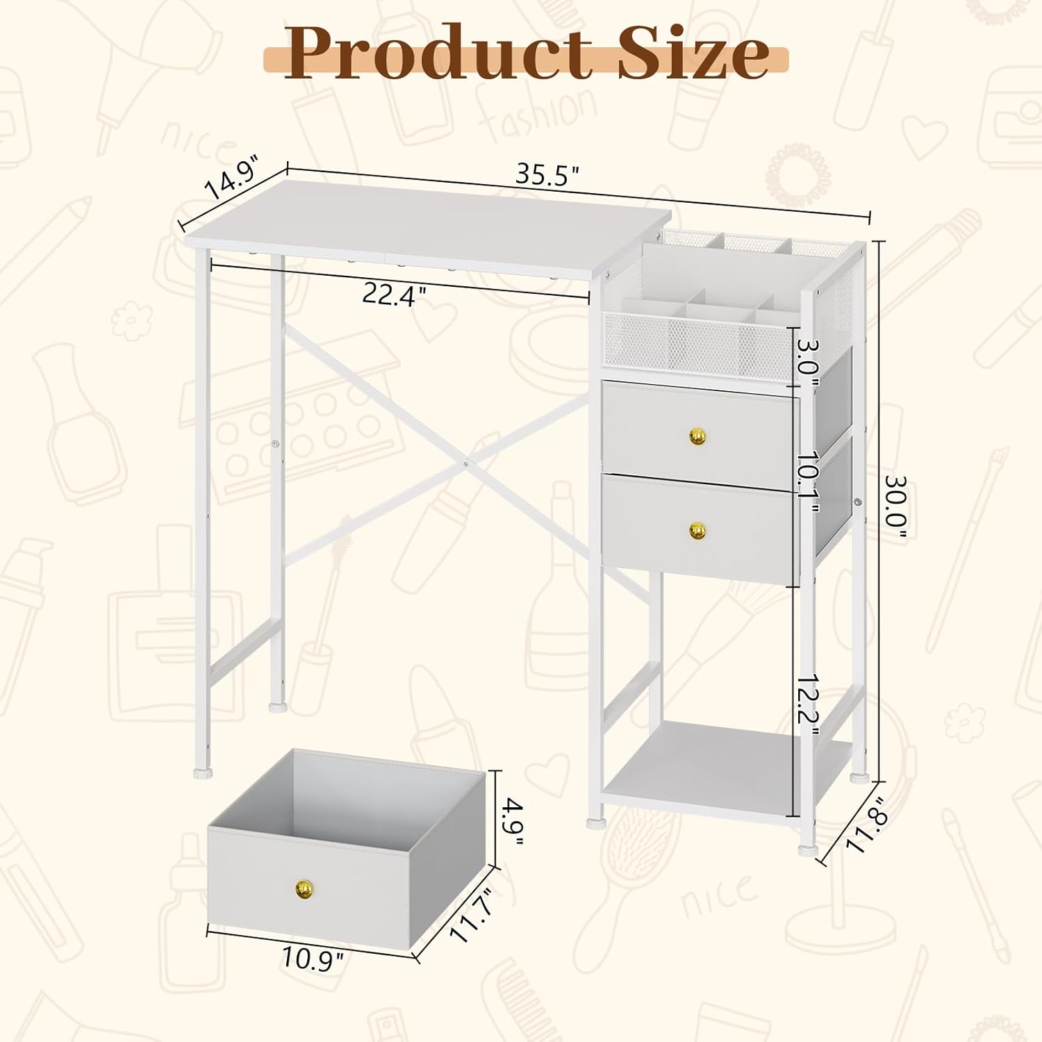 White Vanity Desk with 2 Fabirc Drawers, 9 Compartments, 35.5″ Makeup Table with Diversified Storage Small Vanity Without Mirror & Stool, Storage Shelves Girls Dressing Table for Bedroom