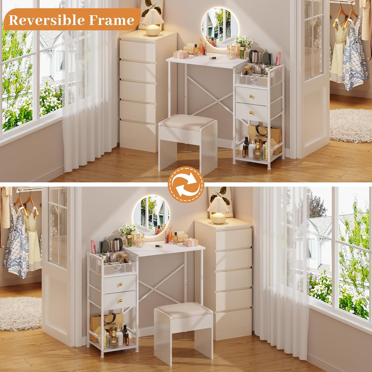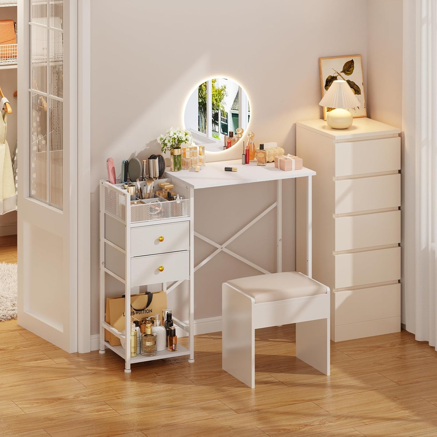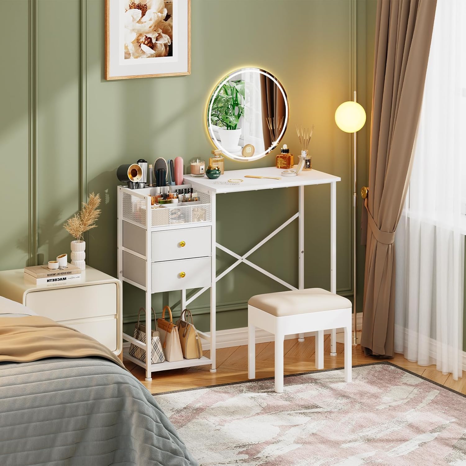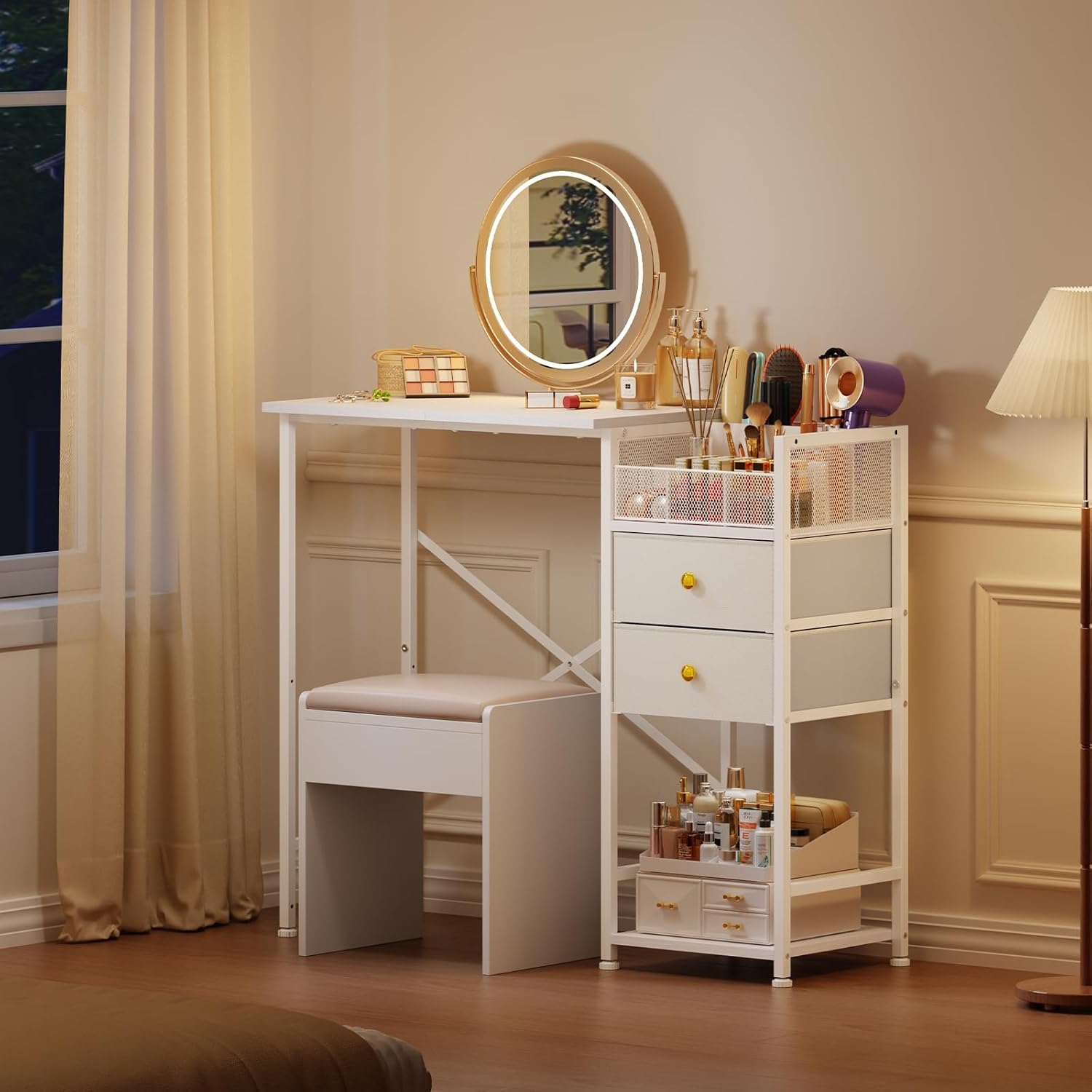 Small Space? Big Style & Storage Win! Don’t let a cozy bedroom hold you back!At just under 3ft wide, this vanity packs a massive storage punch without hogging space. Plus, plenty of legroom means comfy seating – even in the tightest spots.
