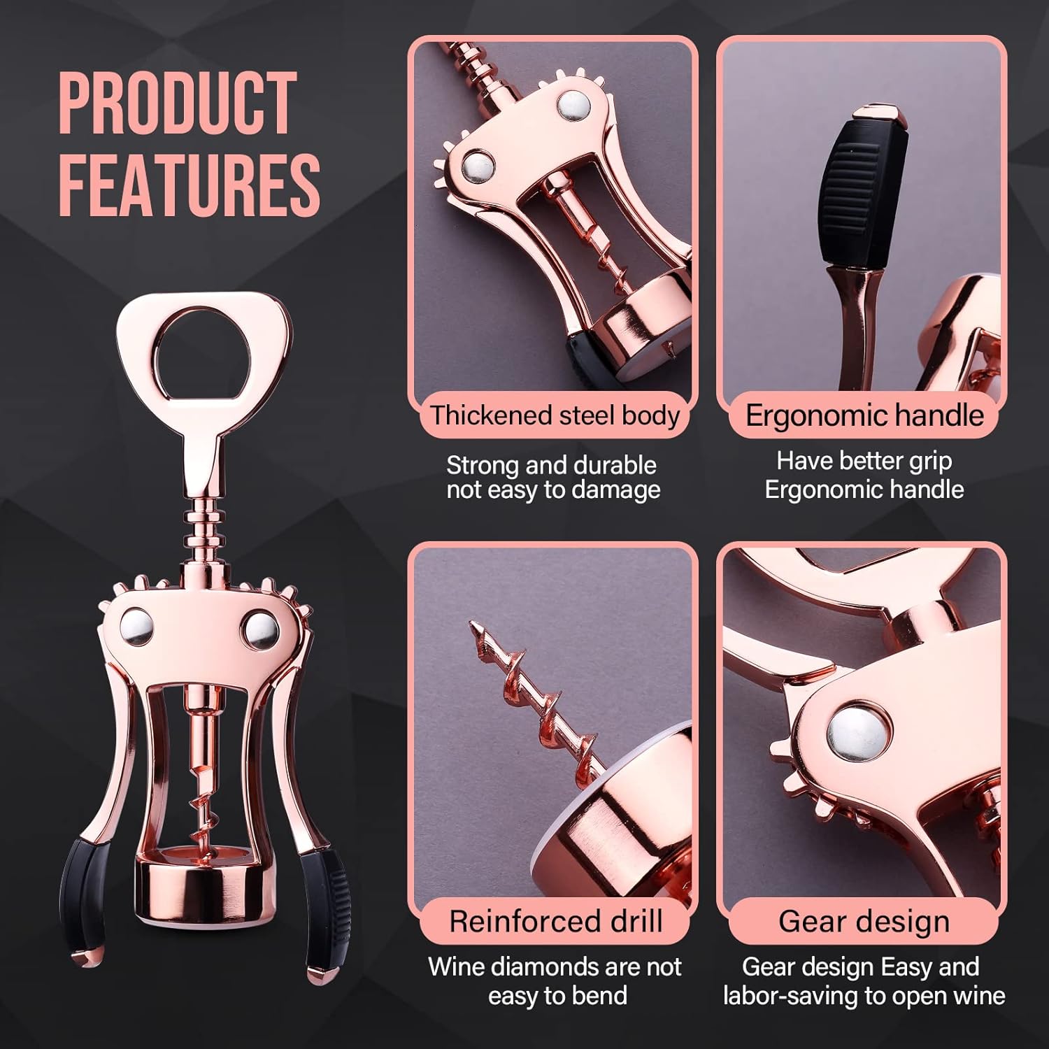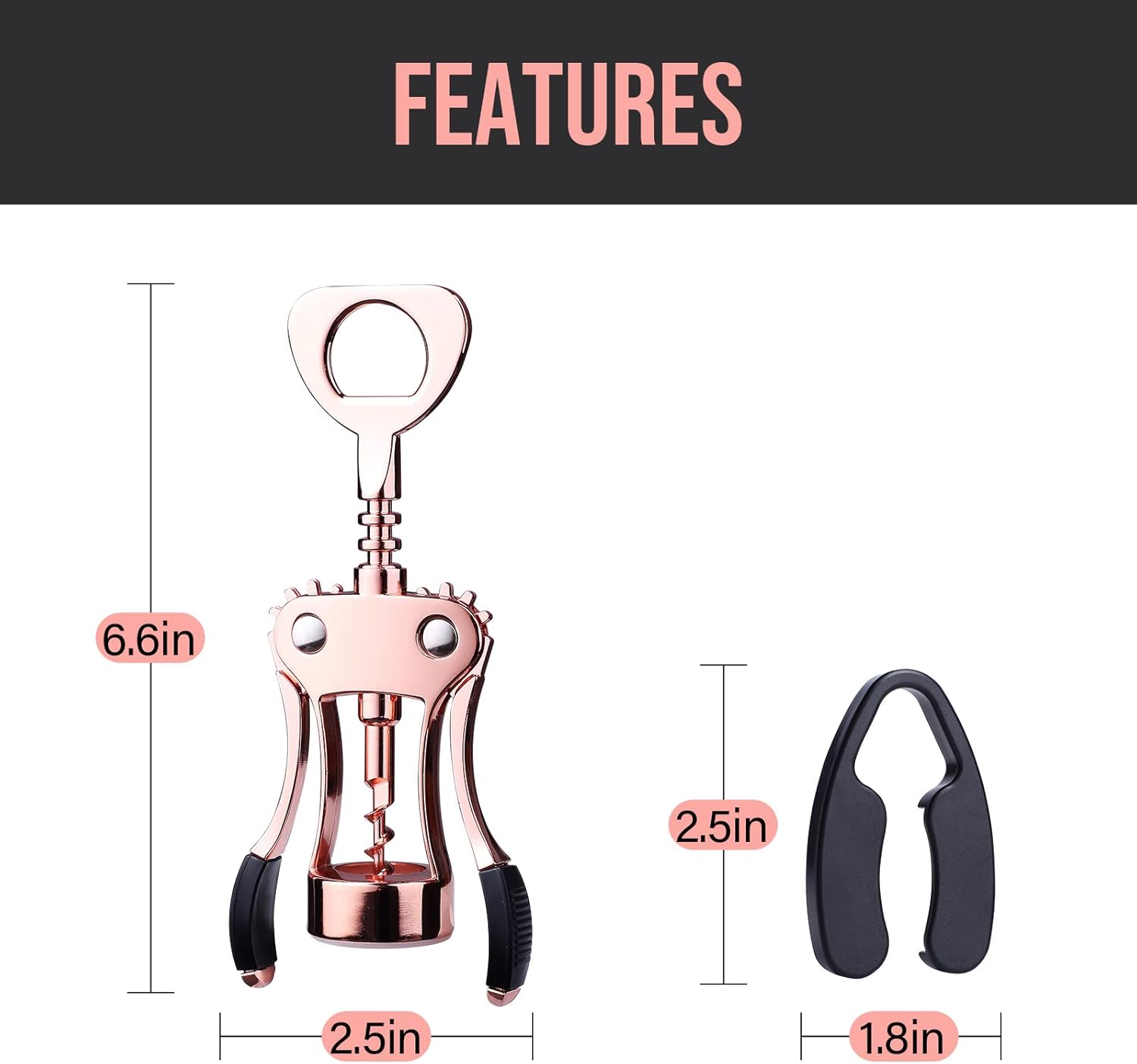 Quick Pop – Just pull down the wings and your cork will come out! Sturdy wings with rubber provide ease and comfort for each grip. And the stable rivets ensure the cork is extracted out of the center.