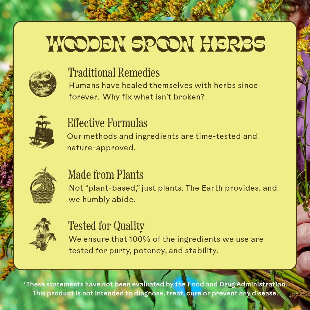 OUR PROMISE TO YOU: At Wooden Spoon Herbs, we’re dedicated to crafting exceptional products with carefully selected, locally sourced ingredients, rigorous testing, and a blend of traditional wisdom and modern research. Vegan, purity-tested, gluten-free, dairy-free, and soy-free.