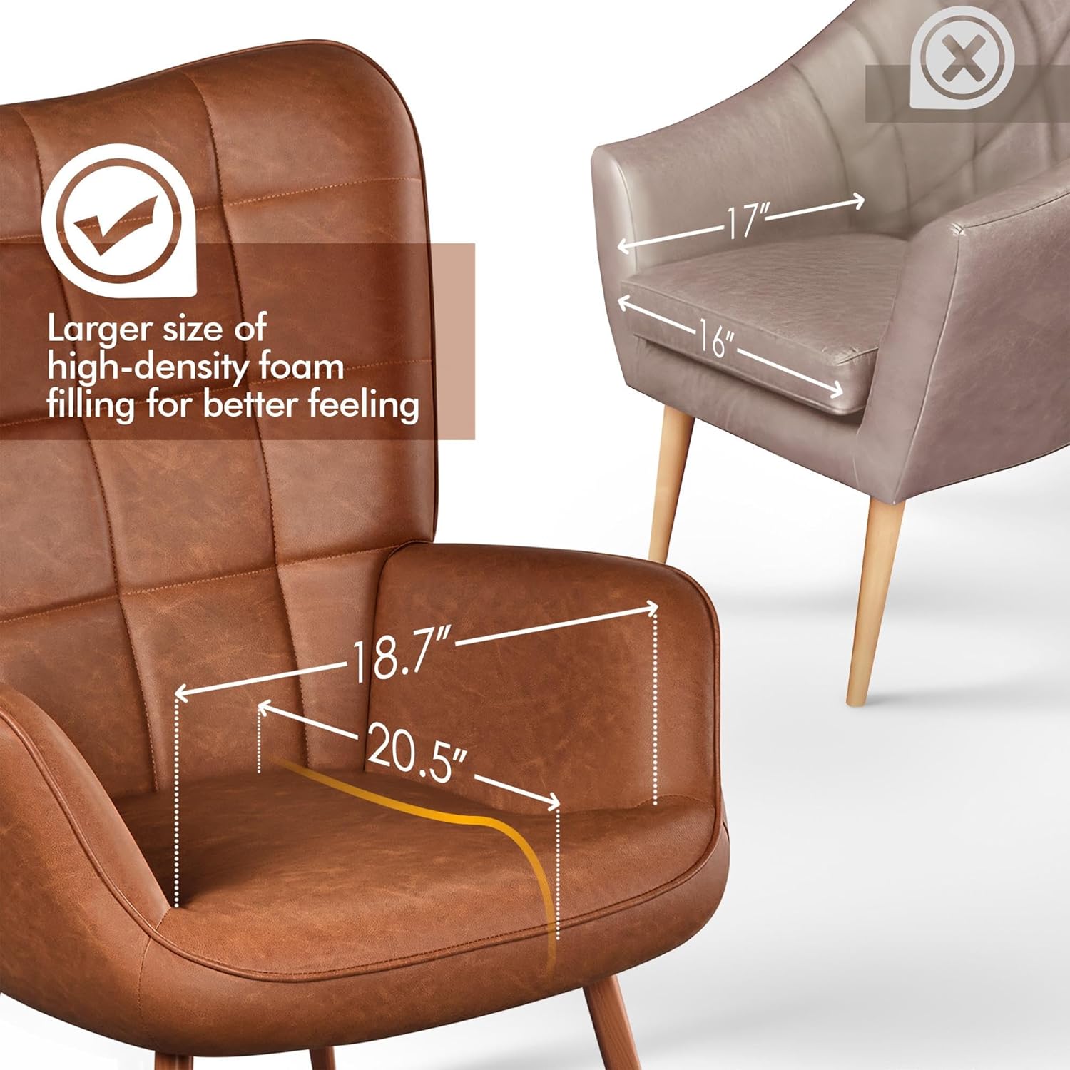 Broad Back, Deep Seat, Super Cozy: The 20″ high back with wing design and the 20.3″ deep seat can embrace your different sitting postures (curl/cross-legged, lean on one side, etc.). Top it with your favorite throw pillow and fluffy blanket, this armchair is your new go-to place to kick back and relax