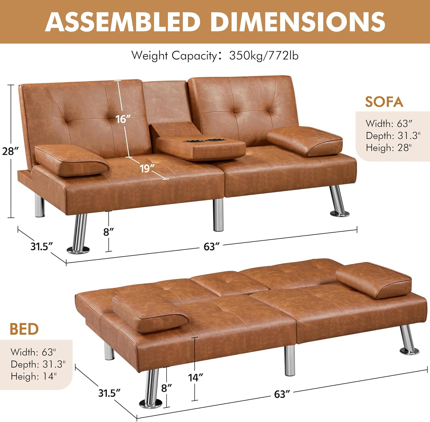 Material Faux Leather, Engineered Wood, Foam, Metal Sofa Dimensions 62.5″ W × 31.5″ D × 28″ H Bed Dimensions 62.5″ W × 37″ D × 14″ H Drop-down Platform 16.7″ L × 11.4″ W Cup Holder Inner Diameter 3.3″ Pillow 16″ L × 9″ W Ground Clearance 8″ Maximum Weight Capacity 772 lb