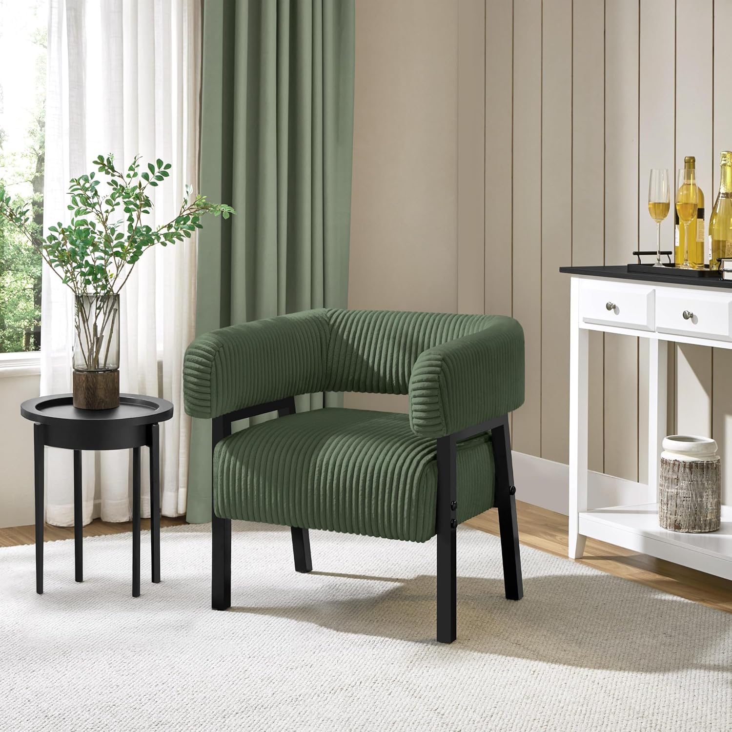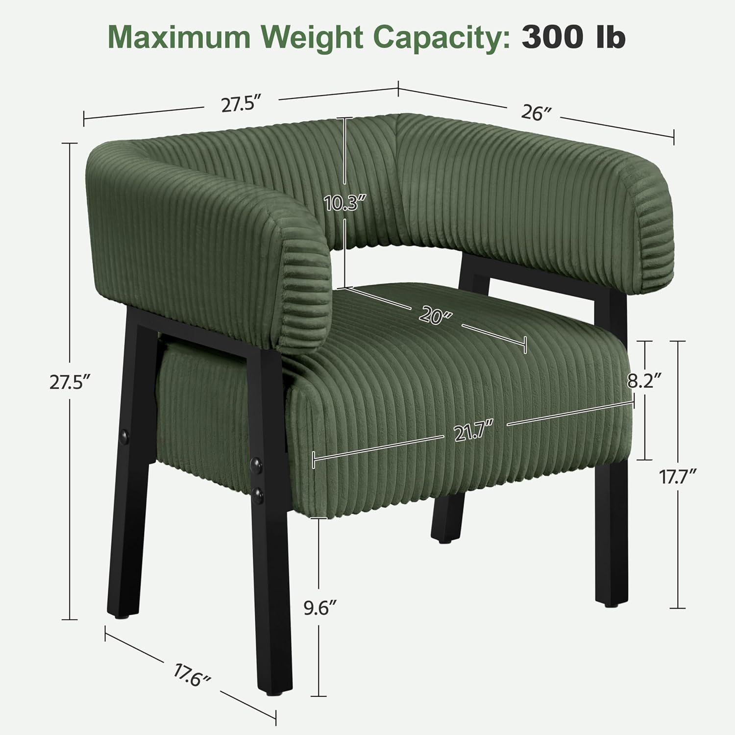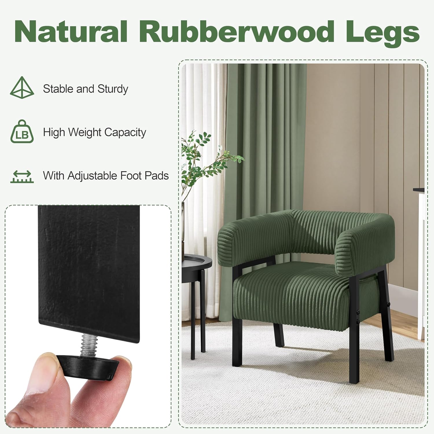 Sturdy Construction: Carefully crafted from a durable engineered wood frame, soft corduroy fabric, and high-density foam, this barrel accent chair ensures a robust weight capacity of 300 lbs. The rubberwood legs provide exceptional structural stability and enhance the chair’s longevity