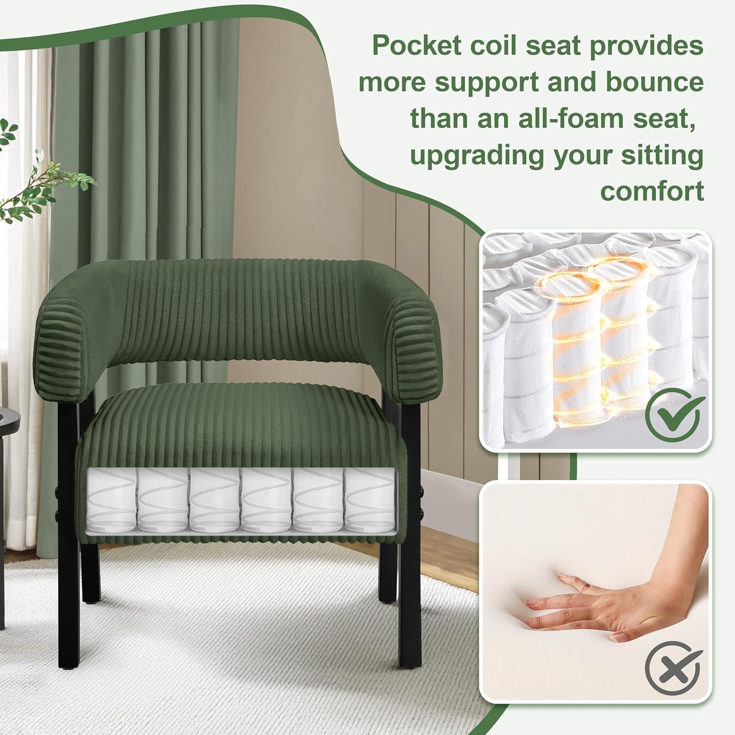 Sofa-level Support: The seat cushion of this barrel chair contains 36 individually wrapped coils, surrounded by soft foam on all sides for balanced support and cushioning comfort. These pocket coils, made from premium steel, maintain their shape longer than those with sinuous springs