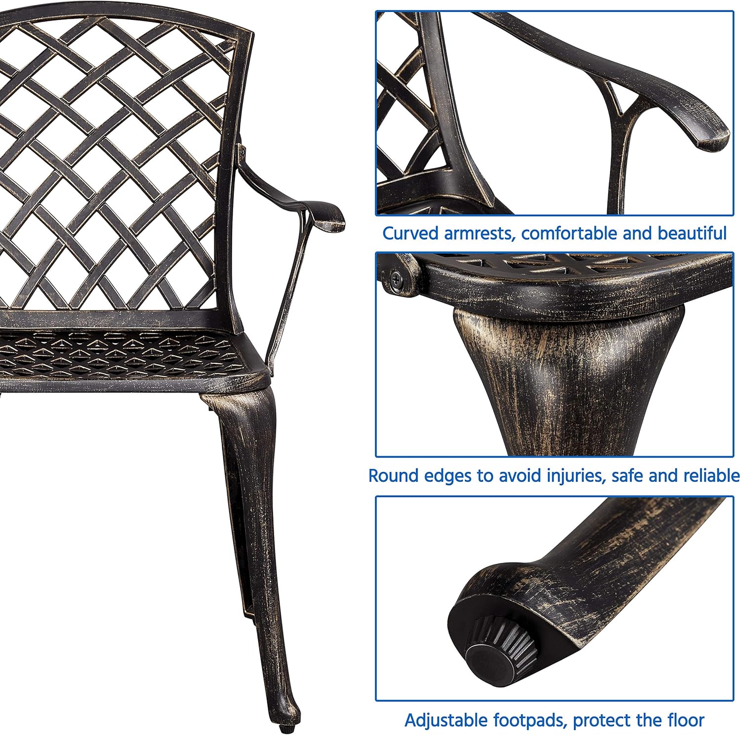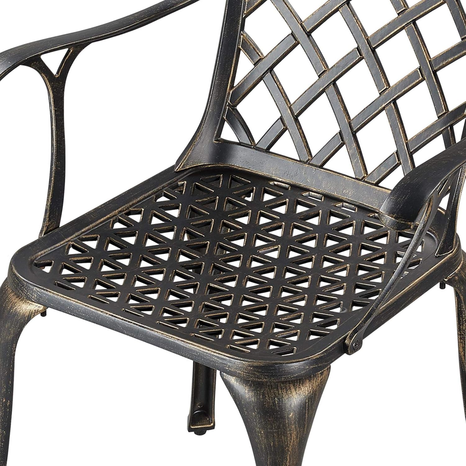 Simple & Classic: This cast aluminum patio chair has an antique and elegant overall look. The grid-patterned seat and back provide improved airflow while offering strong support. Smooth metal surface delivers a sense of rigidity and antiquity, adding a graceful atmosphere to your designated place