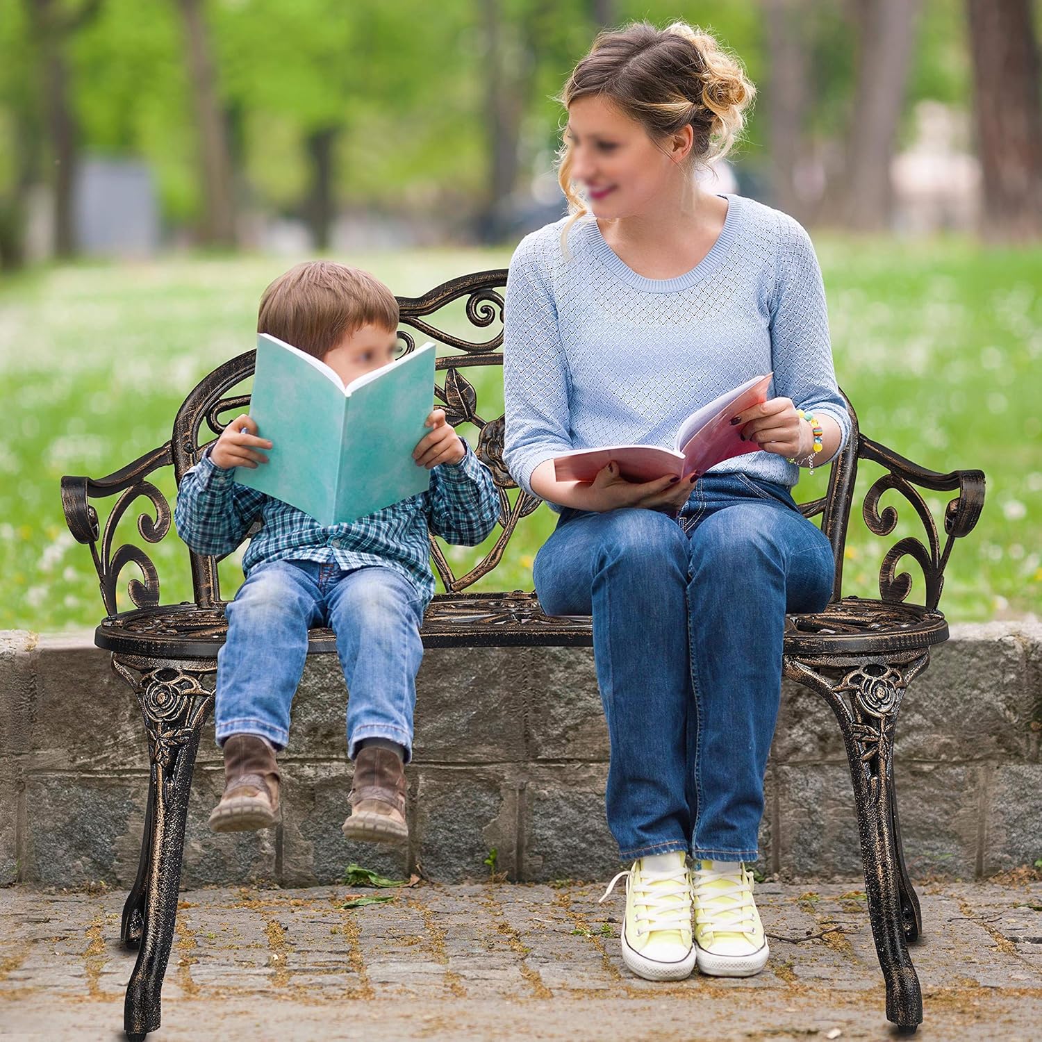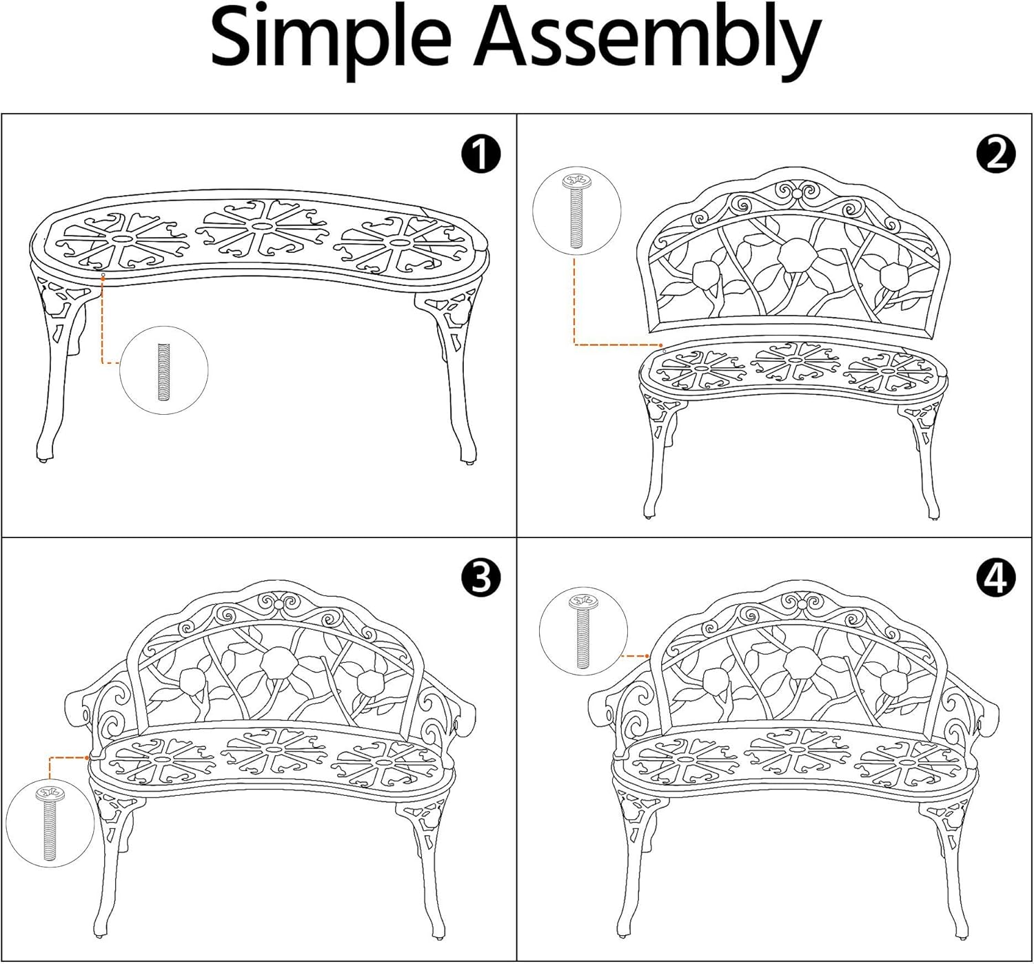 Elegant Antique Look: Floral rose pattern is crafted on the back of this garden bench, delivering a sense of elegance and serenity. The shape of the backrest is also inspired by rose petals and creates a feeling of being cuddled by floral petals while sitting on this garden metal bench. Feel free to let this metal bench add some elegant charm to your backyard.