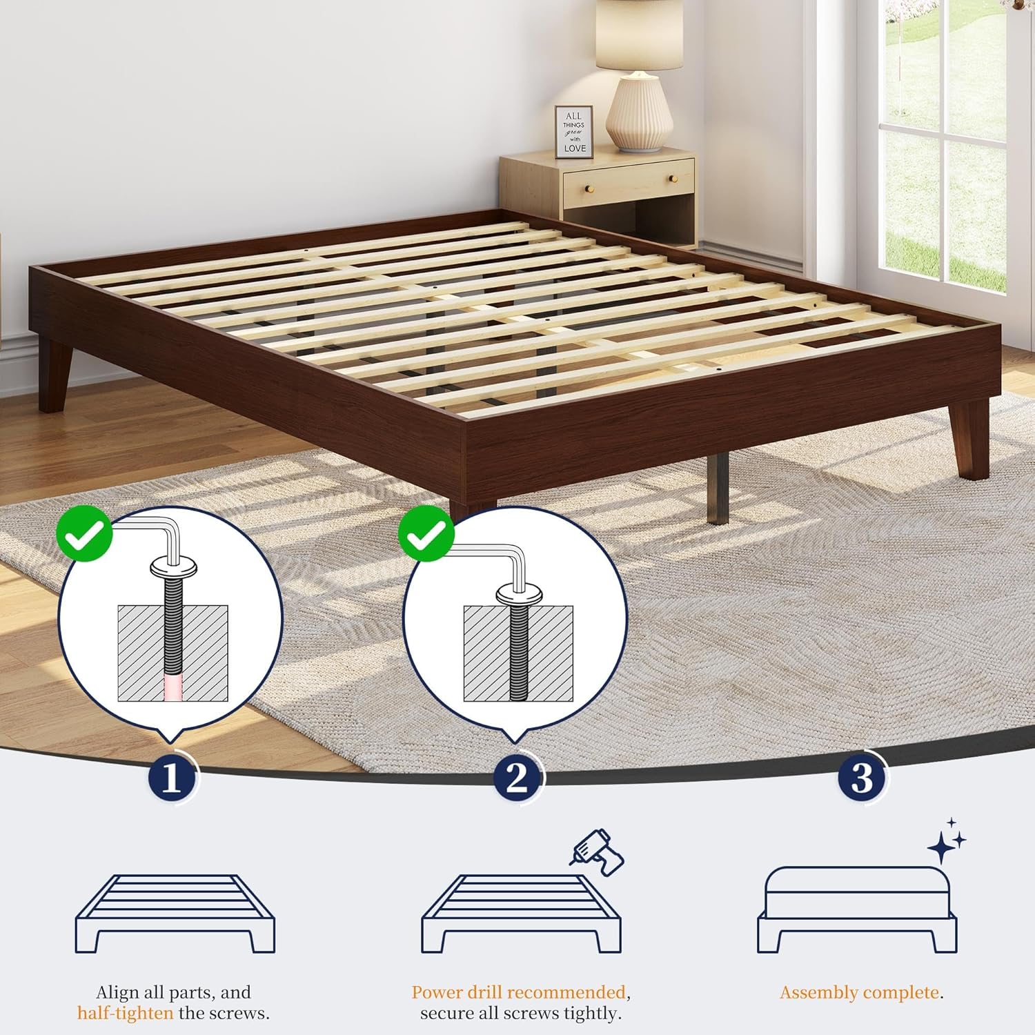 Durable and Quiet Support: The wood bed frame features durable one-piece slats that form a reinforced support system for even weight distribution. This design minimizes movement and noise, while making installation quick and maintenance effortless