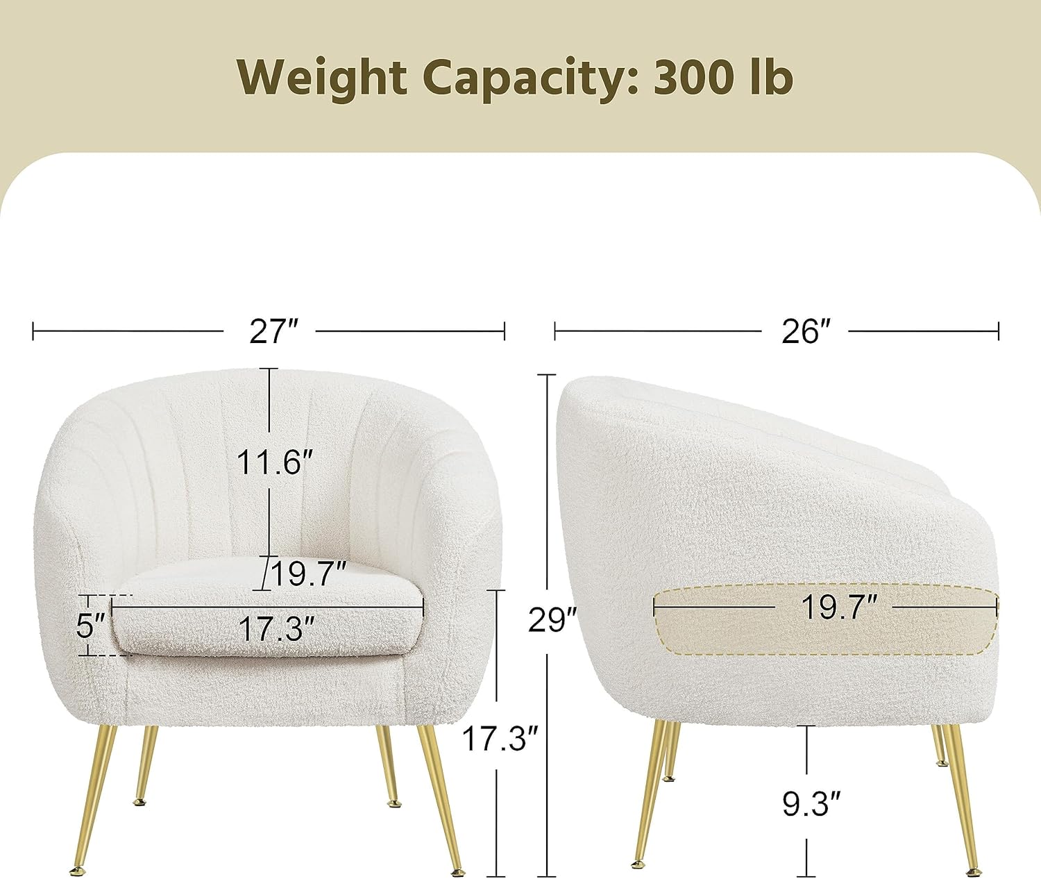 【Integrated Structure & Selected Materials】The integral structure of this barrel accent chair not only strikes a streamlined silhouette but also amps up the overall sturdiness. Built of CARB-compliant engineered wood frame, resilient foam fill, and soft boucle upholstery, the chair features a high weight capacity of 300 lb.