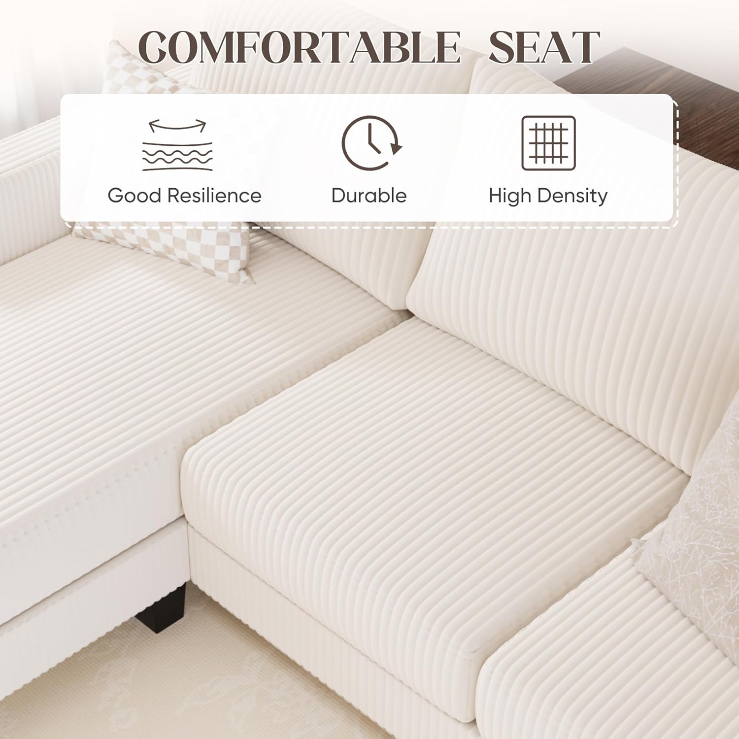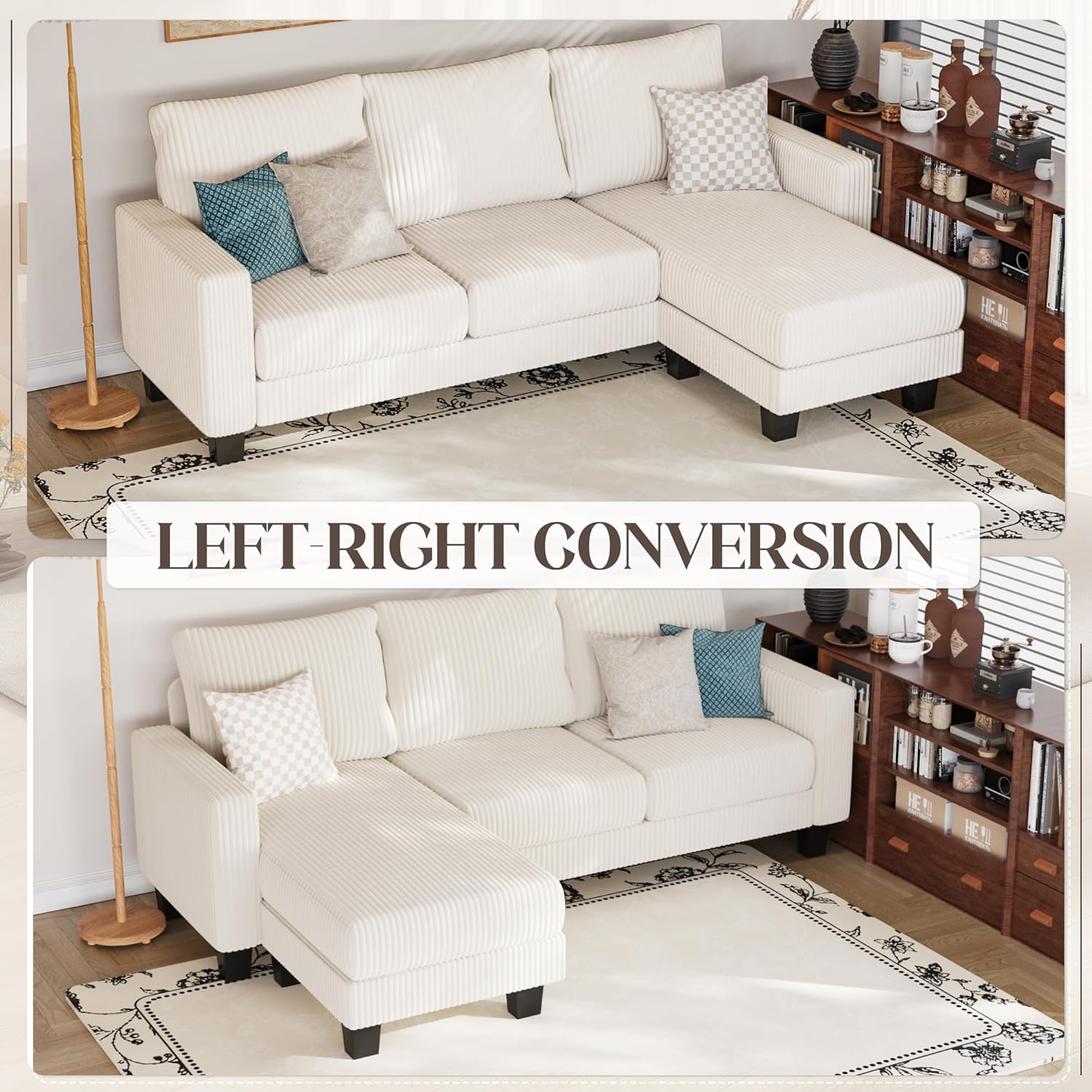 YESHOMY L-shaped Convertible Sectional Sofa, 3 Seater with Corduroy Fabric, Complete with Mobile Footrest, for Living Room, Apartment and Office, 70″, Cream