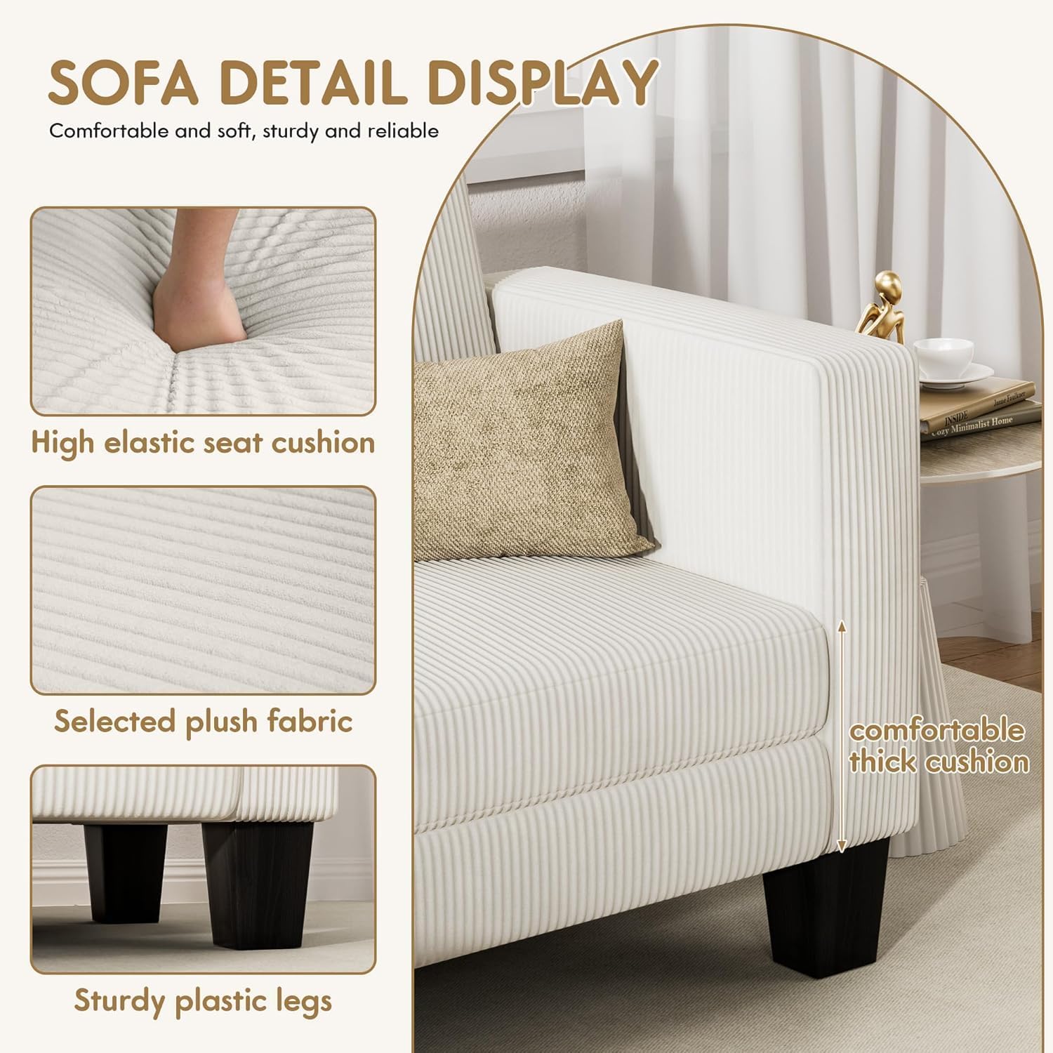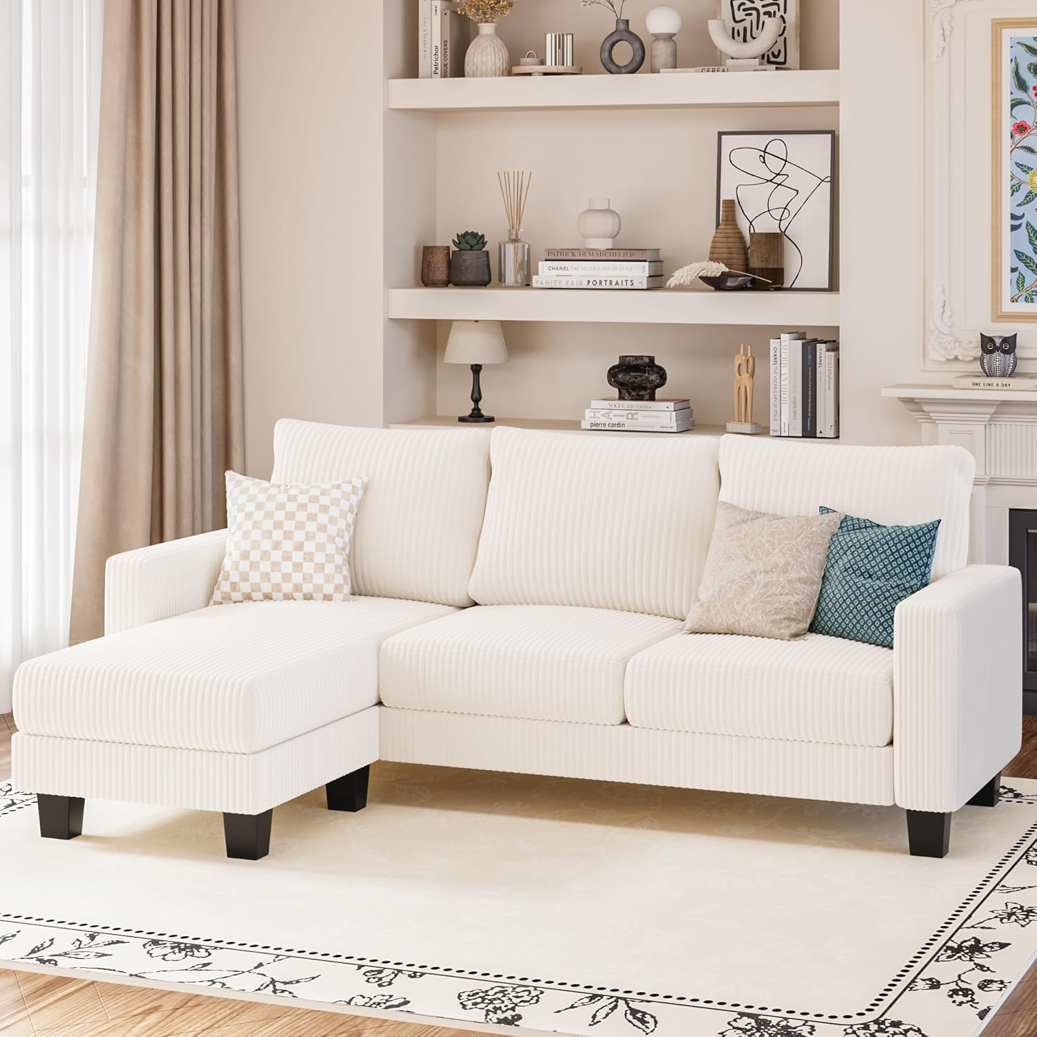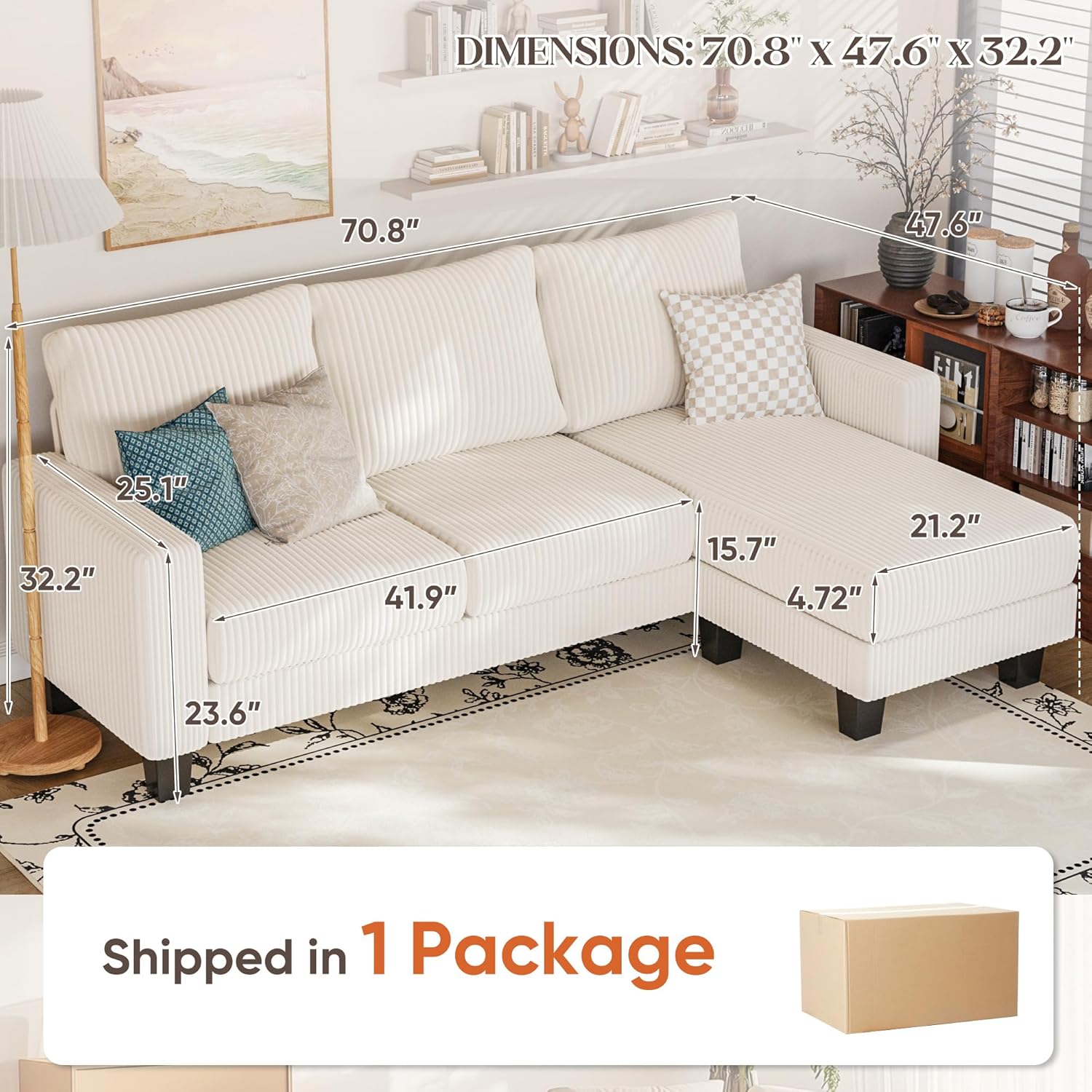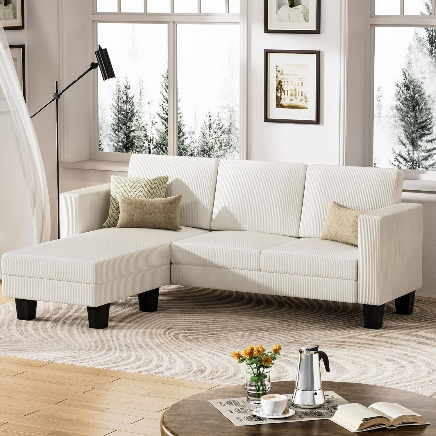 YESHOMY Convertible Sectional Couch, Couches with Mobile Ottoman, Small Sofa L-Shaped 3 Seater with Corduroy Fabric for Living Room, Apartment and Office, 70″,Cream