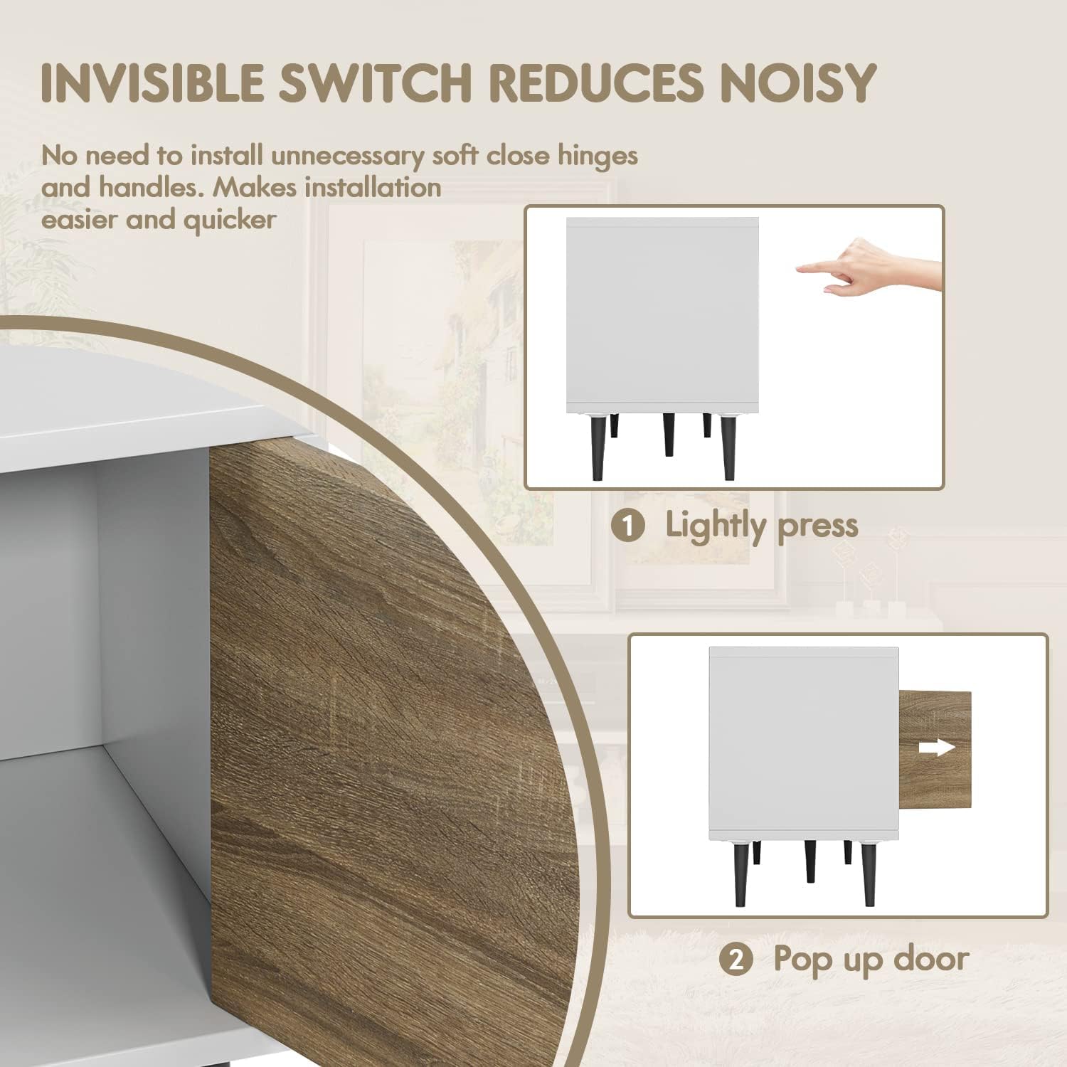 Pop-up Door: The TV stand adopts pop-up doors instead of handles, so that it looks very neat. And there are soft close hinges behind the door, which makes it silent and safe for hand to close.