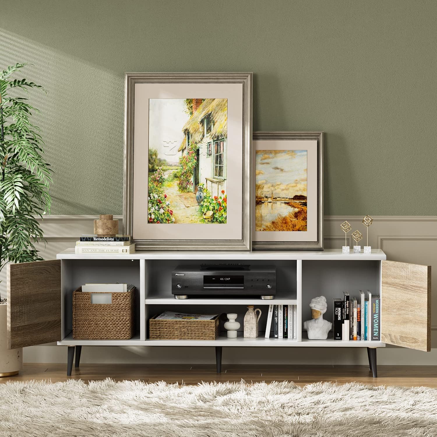 YESHOMY Modern TV Stand for 65″ Television, Entertainment Center with Two Storage Cabinets, Retro Style Media Console for Living Room, Bedroom, Office, 58 Inch, White and Coffee