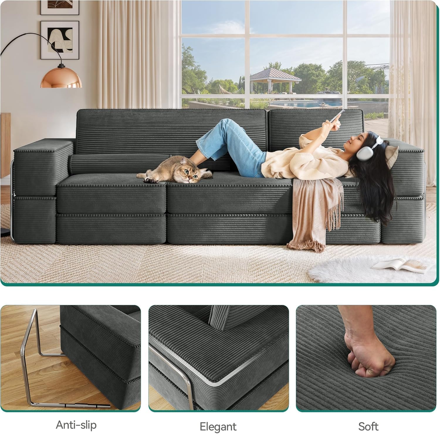 Step into ultimate comfort with the cloud sectional couch, where style meets relaxation. Ideal for any living room, family room, or spacious office, this versatile piece adapts to your lifestyle with over 10 configurations, from a plush bed to a sofa to cozy lounge. Crafted in luxurious corduroy, it offers durability and comfort, with 15.7-inch spring foam cushions that provide soft, supportive relaxation. The 103.5″ width and 29.5″ depth give you plenty of room to unwind, whether you’re reading, napping, or hosting friends. Pet-safe, easy to clean, and requiring no assembly, just unpack, fluff, and enjoy. Features: Over 10 Customizable Configurations: This sectional adapts to your needs, offering personalized comfort for every moment. 15.7″ Spring Foam Cushions: Whether you’re reading, napping, or hosting, these cushions keep you comfortable for hours. Luxurious Corduroy Fabric: Soft corduroy that adds elegance and durability. It’s pet-safe, easy to clean, and fits well into your busy, stylish life. Generous Space for Comfort: With a 103.5″ width and 29.5″ depth, this sectional gives you room to stretch out, relax, and make it your own. 19.6″ High Pillows: The high pillows offer ideal support, great for lounging, reading, or binge-watching your favorite shows. Anti-Slip Bars: Anti-slip bars keep your sectional steady, so you can relax without worry. Specifications: Color: Gray Material: Sponge, Corduroy, Steel