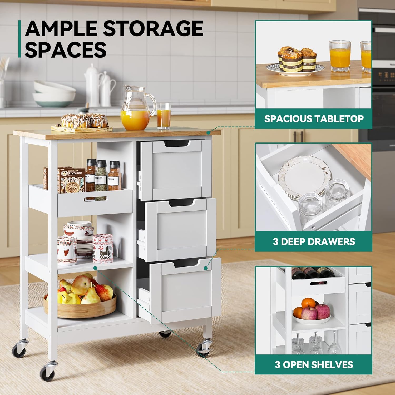 ENOUGH STORAGE SPACE: The wide top of this rolling storage cabinet can be used as cutting board or stand to put a microwave oven, roaster; 3 open shelves & 3 drawers to classify cutlery, pots, pans & other essentials to keep your culinary space neat & clean for small kitchen & dining room.
