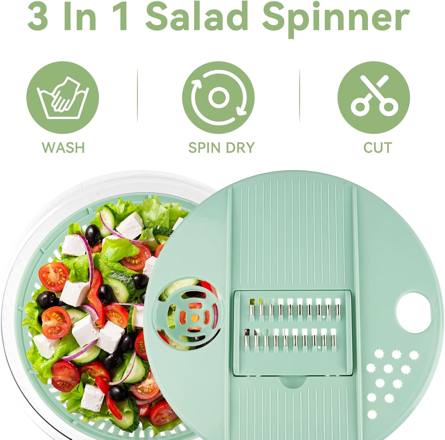 3 IN 1 Multifunctional Kitchen Gadget: This salad spinner with strainer and shredding blade can be used for washing, chopping vegetables, leaving foods crisp and 95% drier. It also includes a salad bowl and a clip for mixing salads.5.3L large capacity measures 9.25 x 5.52 inches.