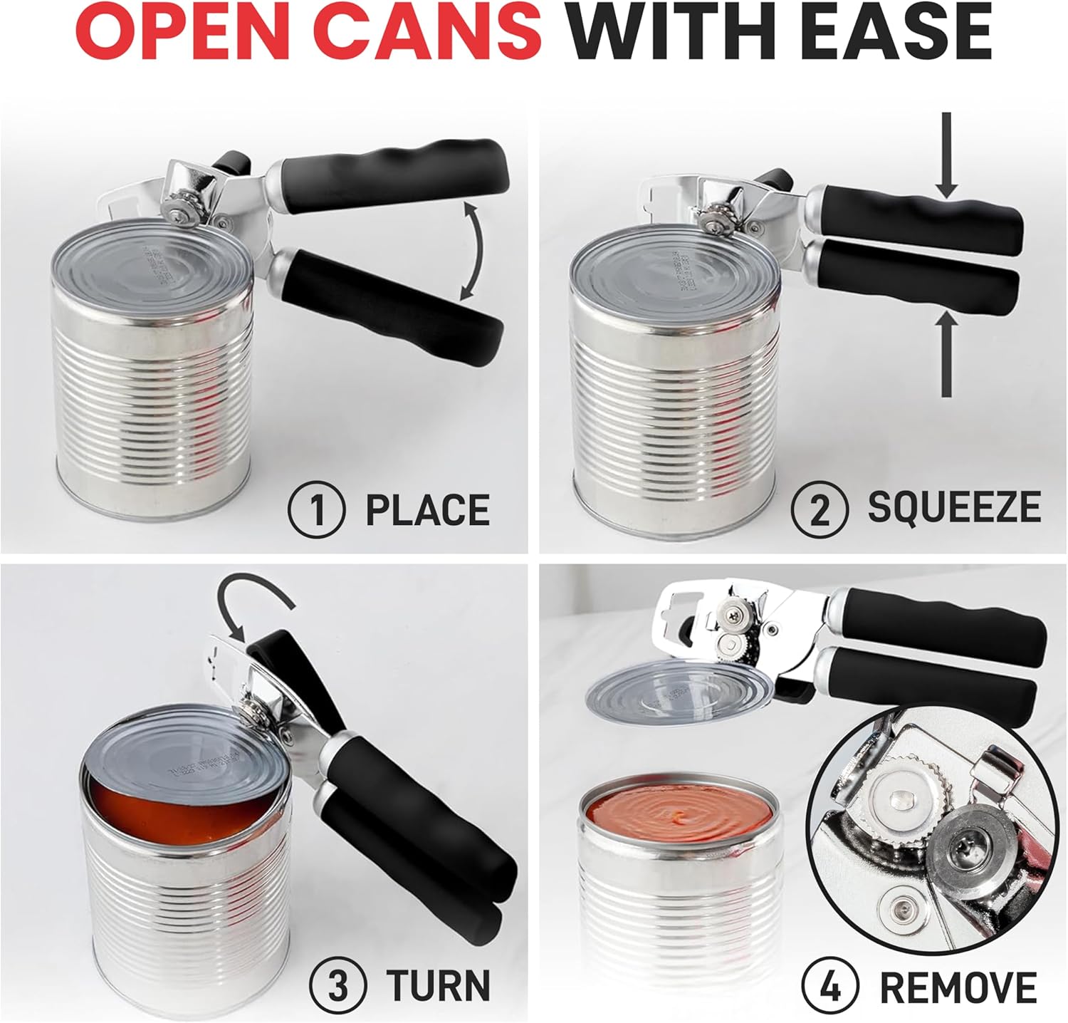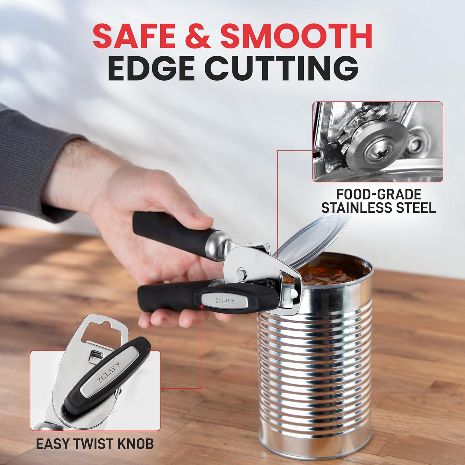 Zulay Kitchen Heavy Duty Stainless Steel Can Opener Manual with Bottle Opener – Rust Proof Manual Can Opener With Turn Knob & Comfy Soft Grip Handles – Black